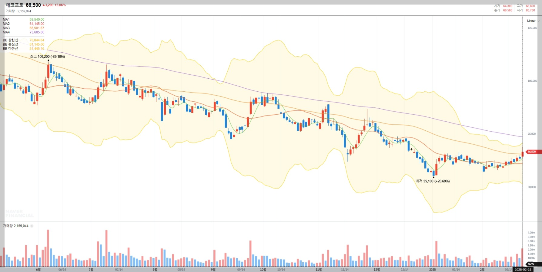 2025년 2월 기준 에코프로의 현재 주가는 62,300원으로 최근 한 달간 약간의 상승세를 보였습니다. 하지만 1년 전 대비 약 52% 하락한 상태입니다.