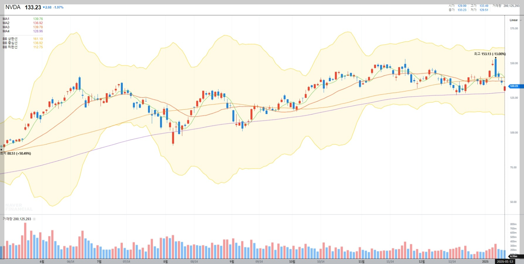 현재 엔비디아의 주가는 $133.23로 거래되고 있으며, 최근 볼린저 밴드 상단을 터치한 후 조정 국면에 진입했습니다.