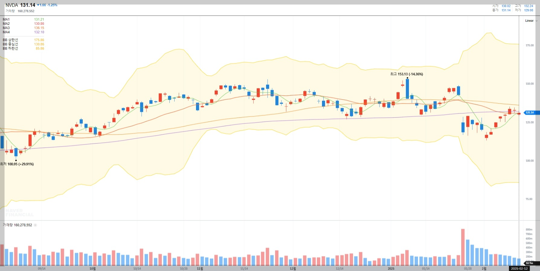2025년 2월 기준 엔비디아의 현재 주가는 131.14달러로, 최근 몇 달간 변동성이 높은 모습을 보였습니다. 볼린저 밴드 상 하단을 기준으로 매매 전략을 세우기 적합한 시점으로 보입니다.