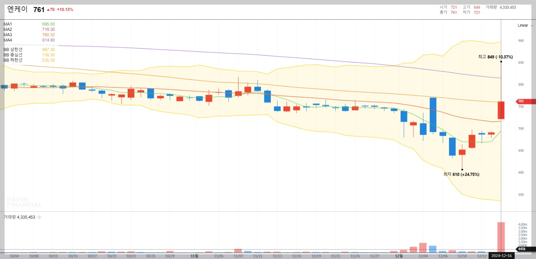12월 16일 기준으로 엔케이의 종가는 761원이며, 최고가는 849원까지 상승했습니다. 거래량은 약 4백만 주를 기록하며 높은 유동성을 보였습니다.