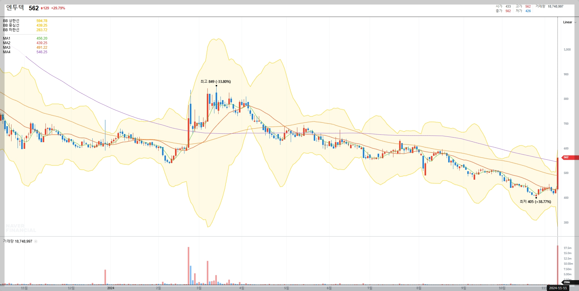 2024년 11월 11일 현재, 엔투텍의 주식 가격은 562원이며, 지난 52주 동안 최고가는 849원, 최저가는 405원으로 나타났습니다.