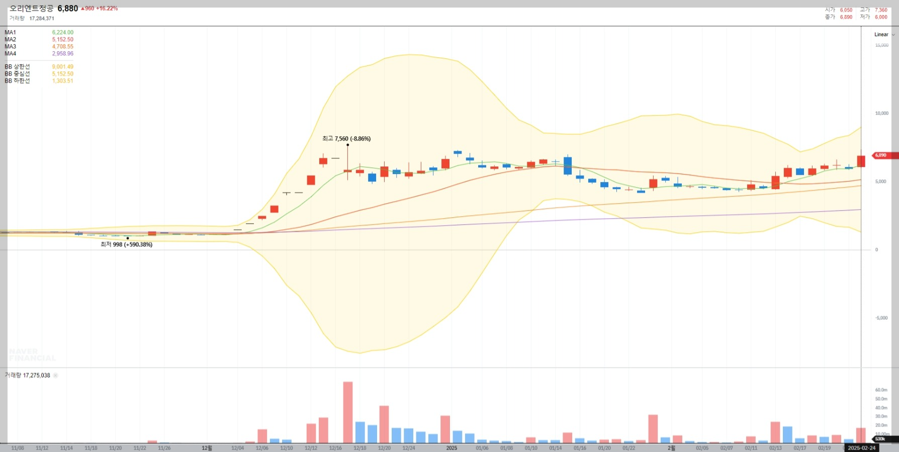 현재 오리엔트정공의 주가는 6,880원으로 전일 대비 16.22% 상승했습니다. 거래량도 급증하며 투자자들의 관심이 집중되고 있습니다. 기술적 분석을 보면 볼린저밴드 상단에 근접한 상태로 추가 상승 가능성이 열려 있습니다.
