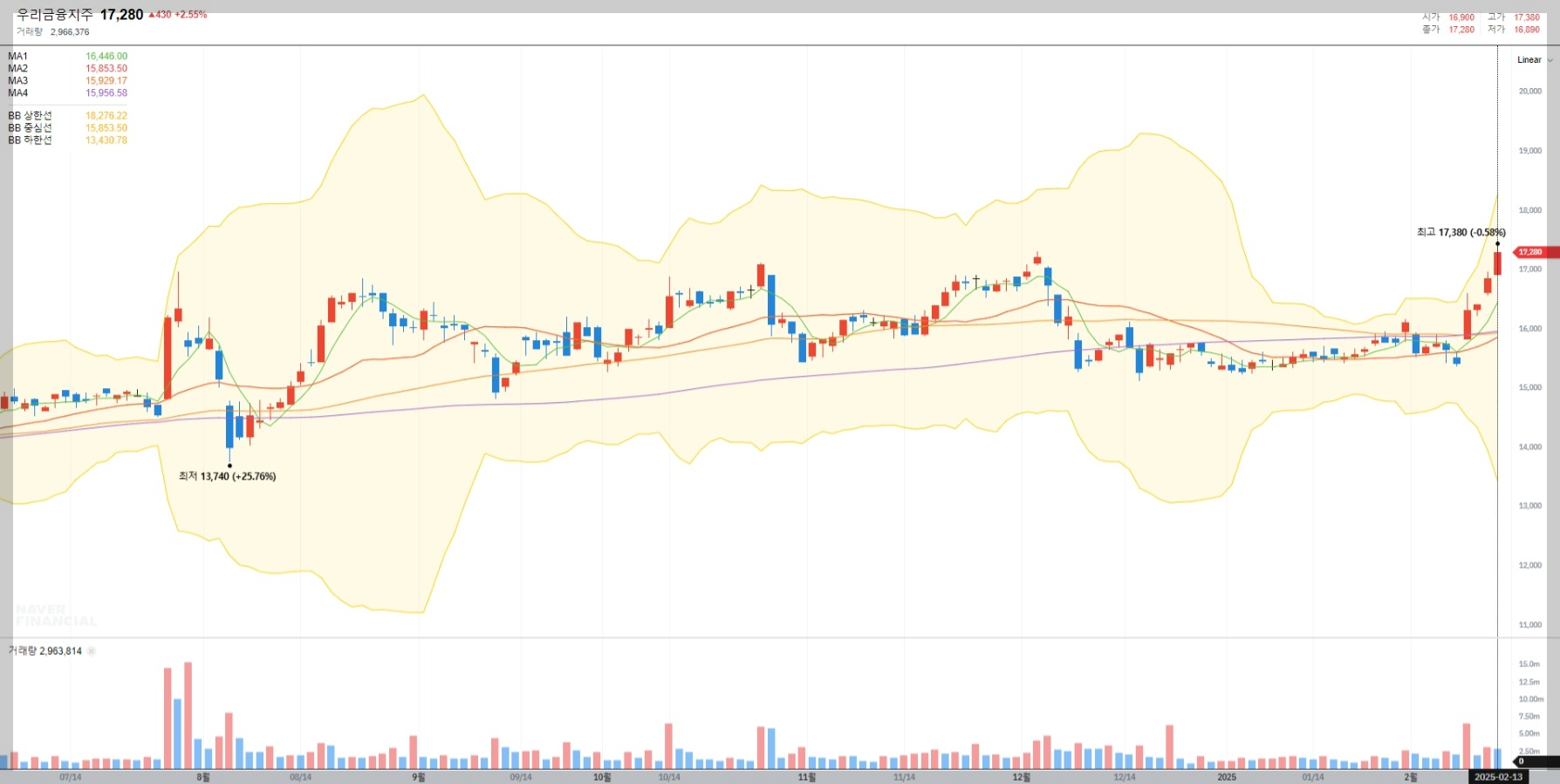 현재 우리금융지주의 주가는 17,280원으로 최근 상승세를 보이고 있습니다. 이는 금융업 전반의 긍정적인 전망과 더불어 안정적인 실적 발표에 따른 결과로 보입니다.