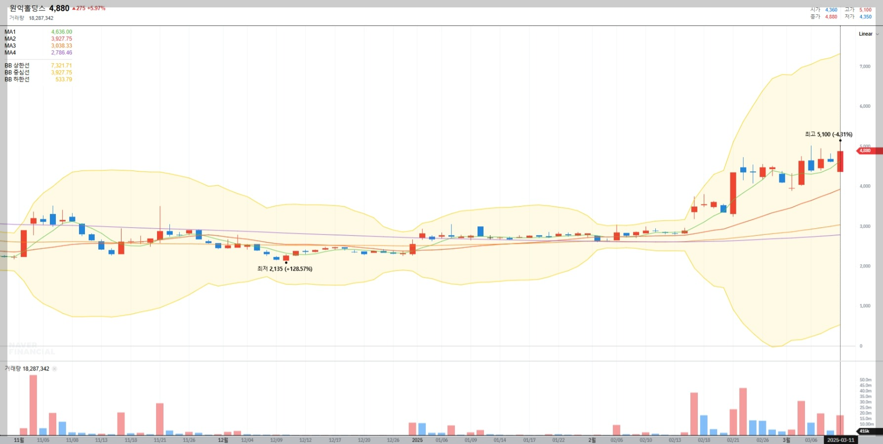 2025년 3월 11일 기준 원익홀딩스의 종가는 4,880원으로 전일 대비 5.97% 상승했습니다. 최근 거래량 증가와 함께 52주 신고가를 경신하며 강한 상승세를 보이고 있습니다.