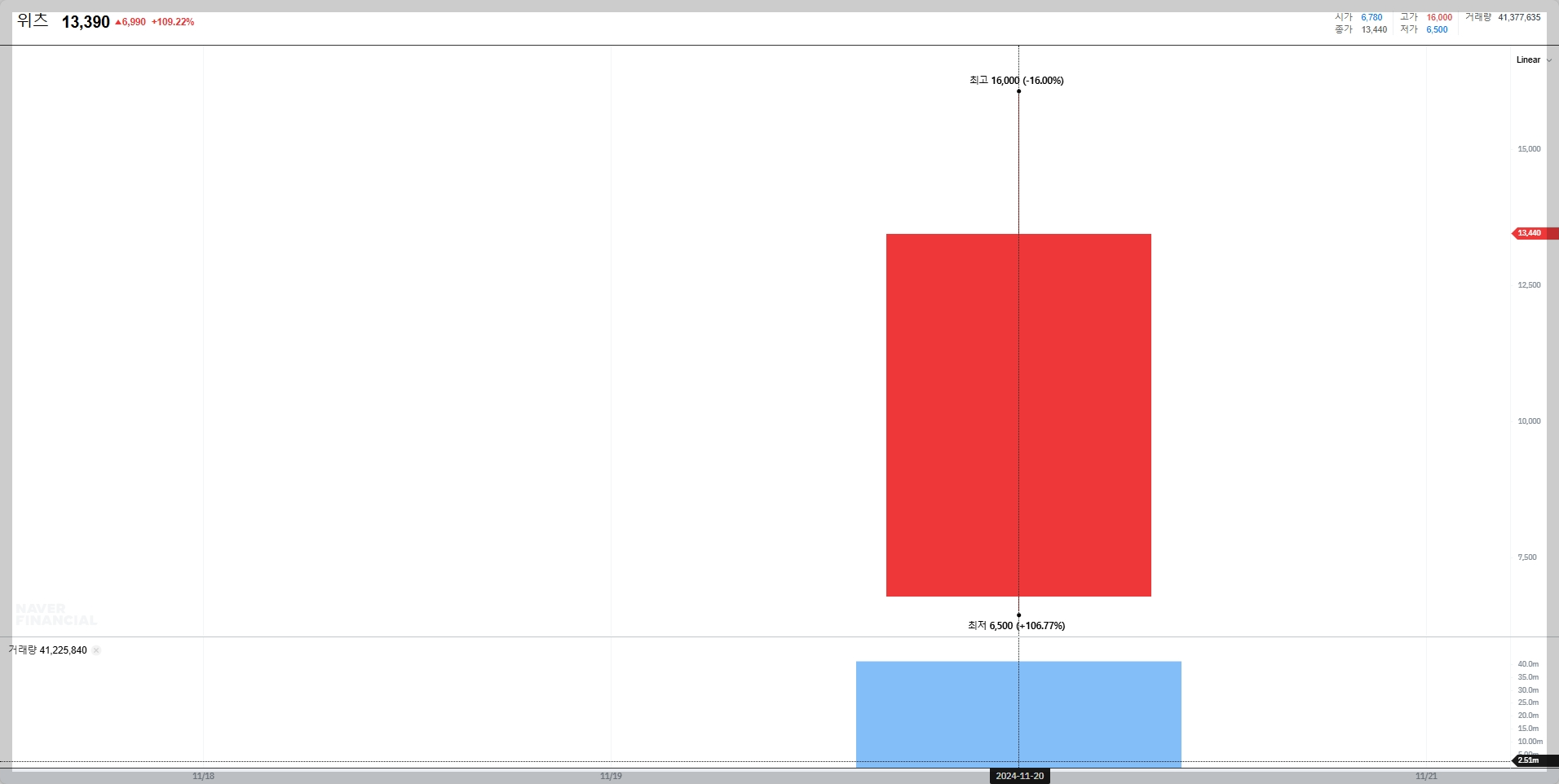 상장 첫날인 2024년 11월 20일 위츠의 주가는 급등하며 13,390원을 기록했습니다. 이는 공모가 대비 약 109% 상승한 수치로 투자자들의 기대감을 반영하고 있습니다.