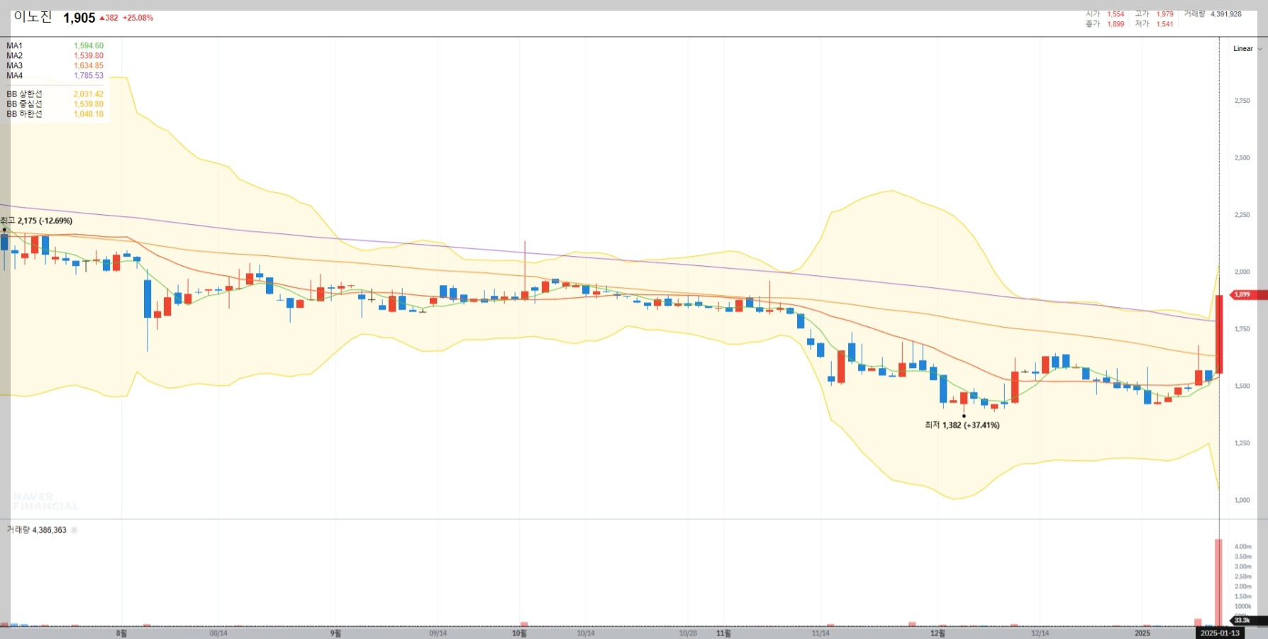 2025년 1월 13일 기준, 이노진의 주가는 전일 대비 25% 상승한 1,905원을 기록했습니다. 이는 최근 신제품 출시와 실적 개선 기대감에 따른 것으로 보입니다.