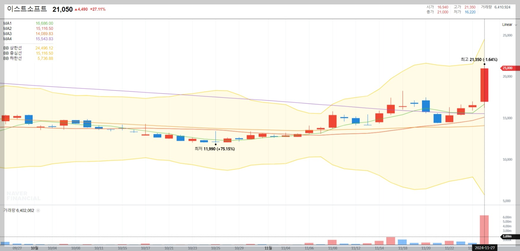 2024년 11월 27일 기준 이스트소프트의 종가는 21,050원으로 전일 대비 27.11% 상승했습니다. 거래량은 약 6.4백만 주로 급격히 증가하며 강한 매수세를 보였습니다.