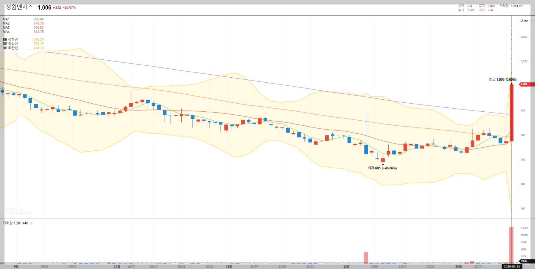 2025년 1월 15일 기준 정원엔시스의 주가는 1,006원으로 상한가(+29.97%)를 기록했습니다. 이는 최근 거래량 증가와 실적 개선 기대감이 반영된 결과로 보입니다.