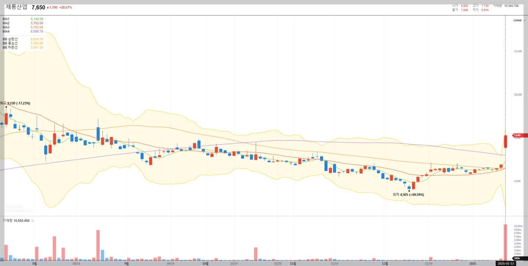 현재 제룡산업의 주가는 7,650원으로 전일 대비 28.57% 상승했습니다. 거래량은 평소보다 크게 증가하며 투자자들의 관심이 집중되고 있습니다.