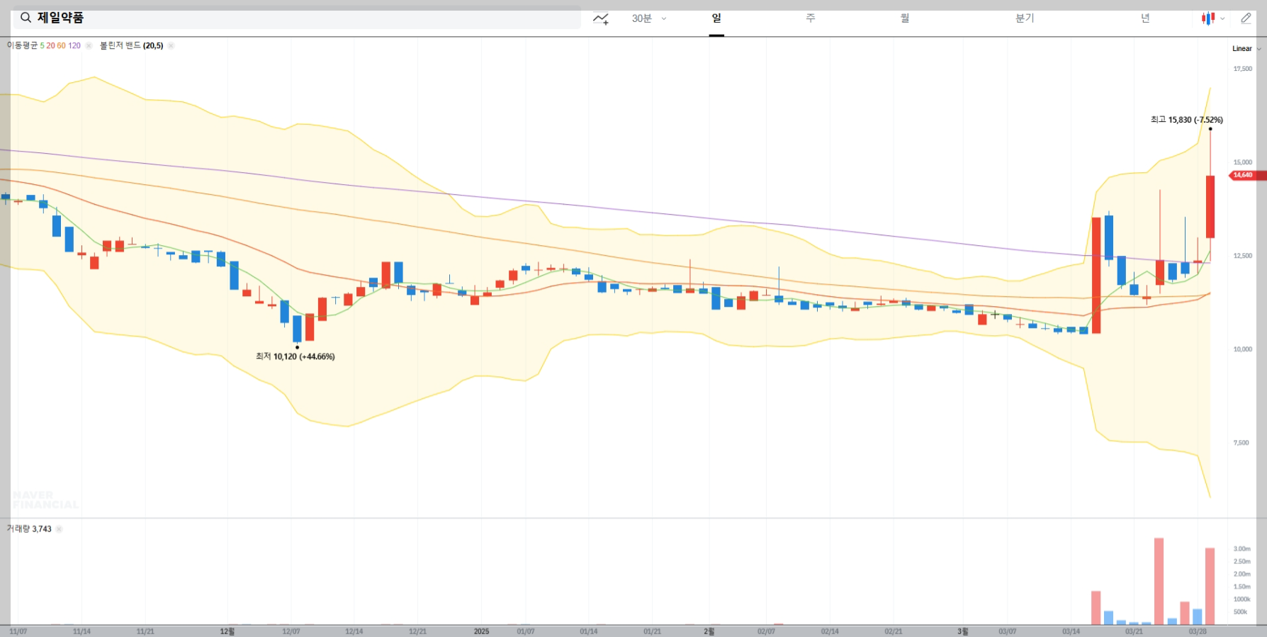 제일약품은 2025년 3월 31일 기준 14,640원에 거래를 마쳤습니다. 전일 대비 2,280원(18.45%) 상승한 수치로, 최근 제약 섹터 전반의 상승세 속에서도 두드러진 성과를 보여주고 있습니다. 거래량 또한 평소보다 크게 증가하여 시장의 관심이 집중되고 있음을 알 수 있습니다.