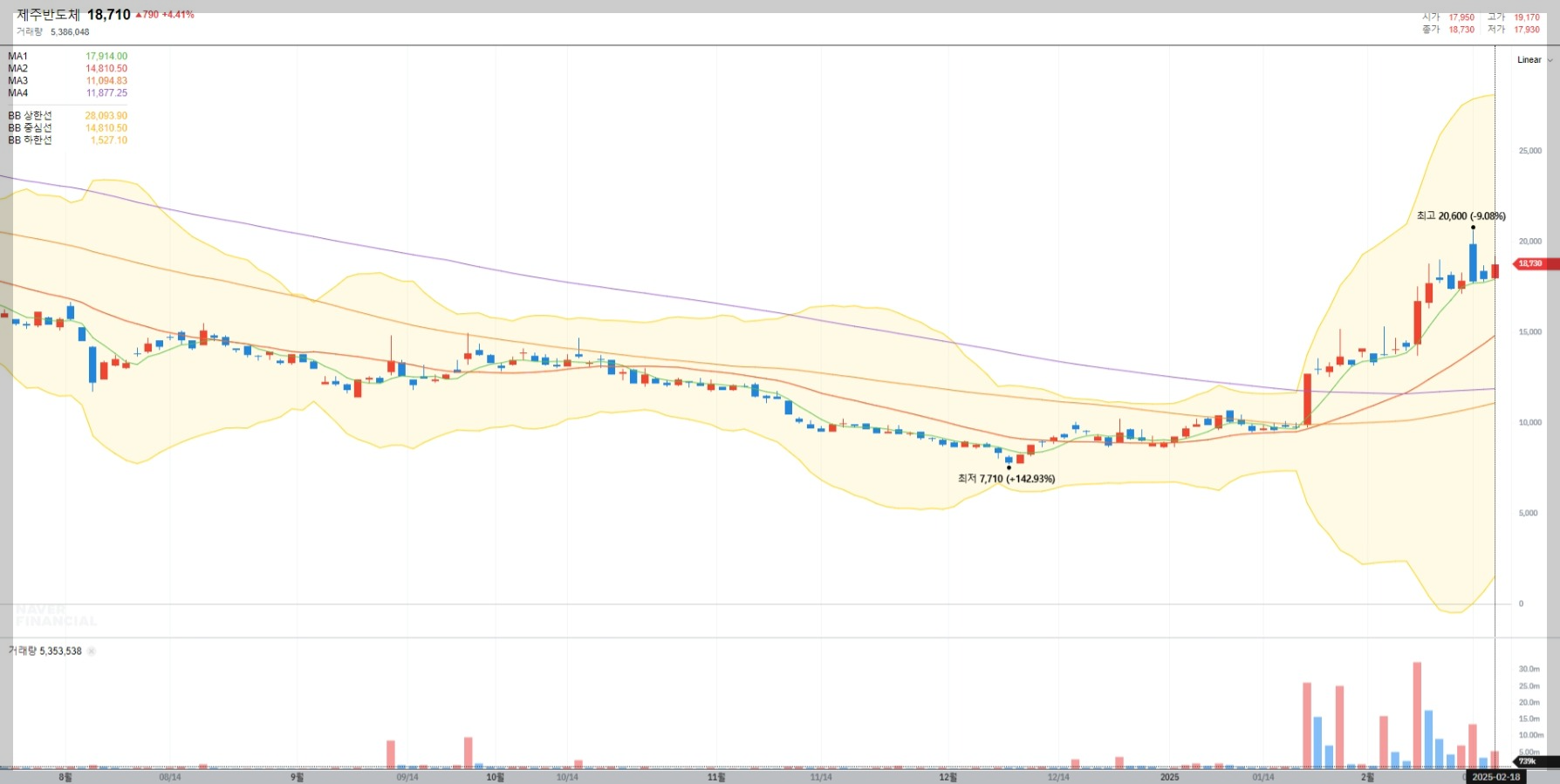2025년 2월 18일 기준 제주반도체의 현재 주가는 18,710원입니다. 이는 최근 몇 달간의 상승세를 반영한 결과로, 투자자들의 긍정적인 평가를 받고 있음을 보여줍니다.