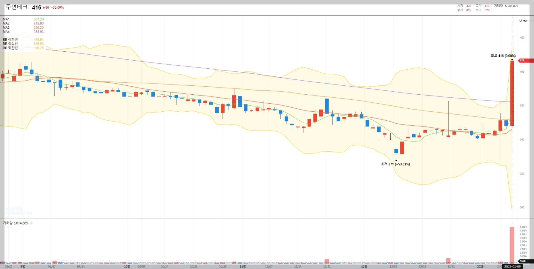 2025년 1월 9일 기준, 주연테크의 주가는 416원으로 전일 대비 30% 상승하며 상한가를 기록했습니다. 이는 최근 볼린저밴드 상단을 돌파한 기술적 신호와 맞물려 단기적인 매수세가 강화된 결과로 보입니다.