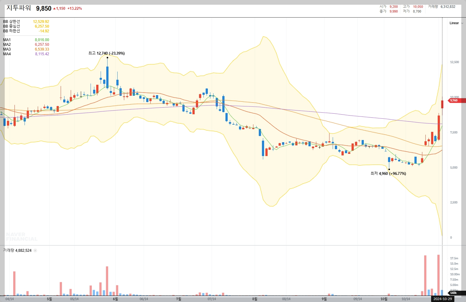 2024년 10월 29일 현재, 지투파워의 주식은 9,850원에 거래되고 있습니다. 최근에는 주가 변동성이 커지면서 투자자들의 주목을 받고 있습니다.