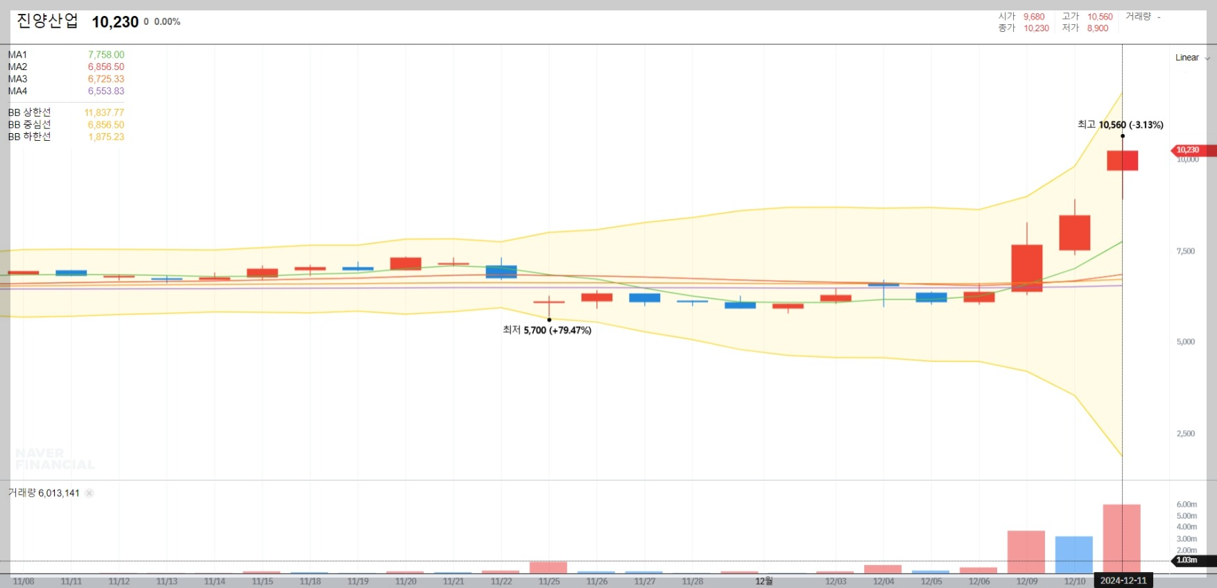 2024년 12월 11일 기준으로 진양산업의 주가는 전일 대비 약 20.92% 상승하여 10,230원에 거래되고 있습니다. 이러한 급등은 투자자들 사이에서 긍정적인 신호로 받아들여지고 있습니다.