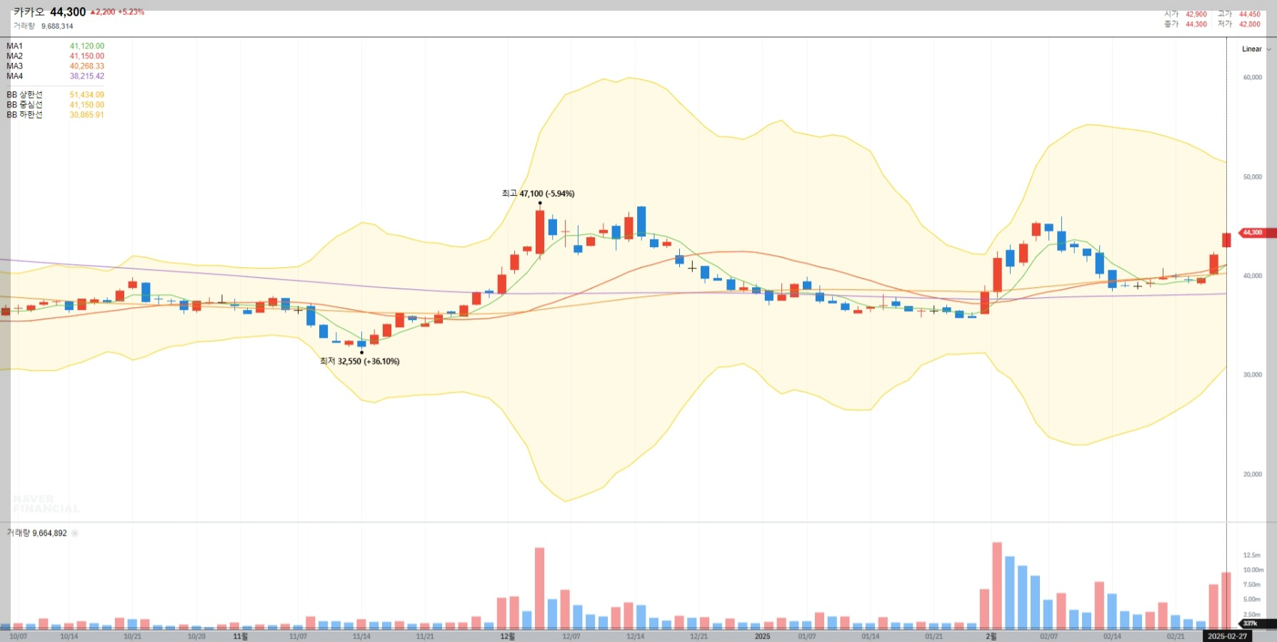 2025년 2월 27일 기준, 카카오의 주가는 44,300원으로 전일 대비 5.23% 상승했습니다. 이는 최근 거래량 증가와 함께 긍정적인 시장 반응을 반영한 것으로 보입니다.