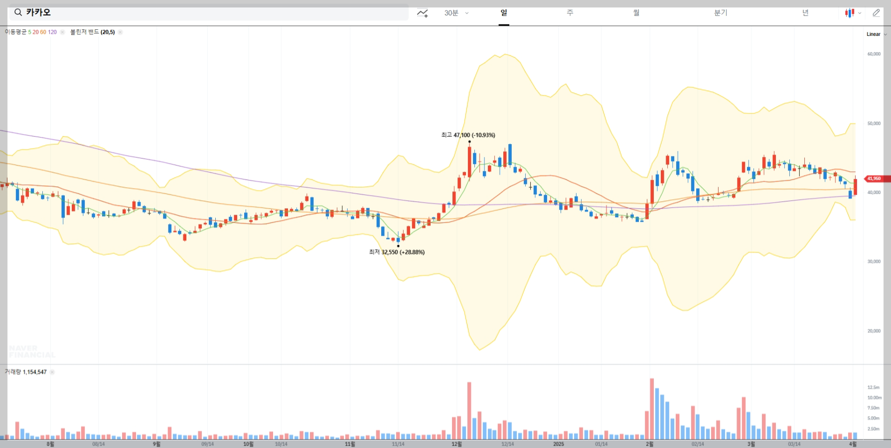 현재 카카오의 주가는 41,850원으로 전일 대비 7.03% 상승한 모습을 보이고 있습니다(2025년 4월 1일 기준) 이는 투자자들의 긍정적인 심리가 반영된 결과로 보이며, 단기적으로 추가 상승 가능성이 점쳐지고 있습니다.