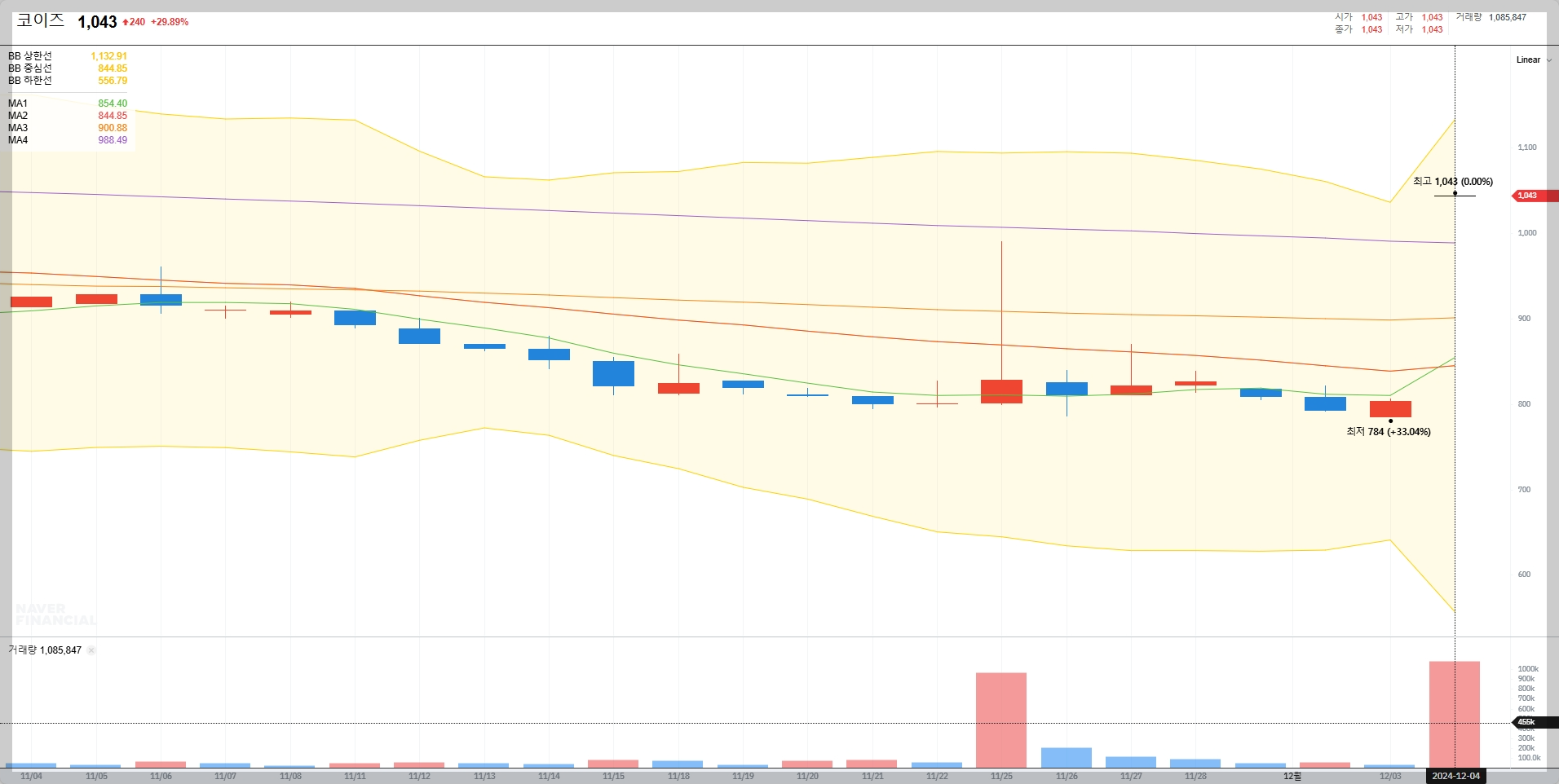 2024년 12월 현재 코이즈의 주가는 1,043원이며, 시가총액은 약 307억 원입니다. 주가는 상한가에 도달했습니다.
