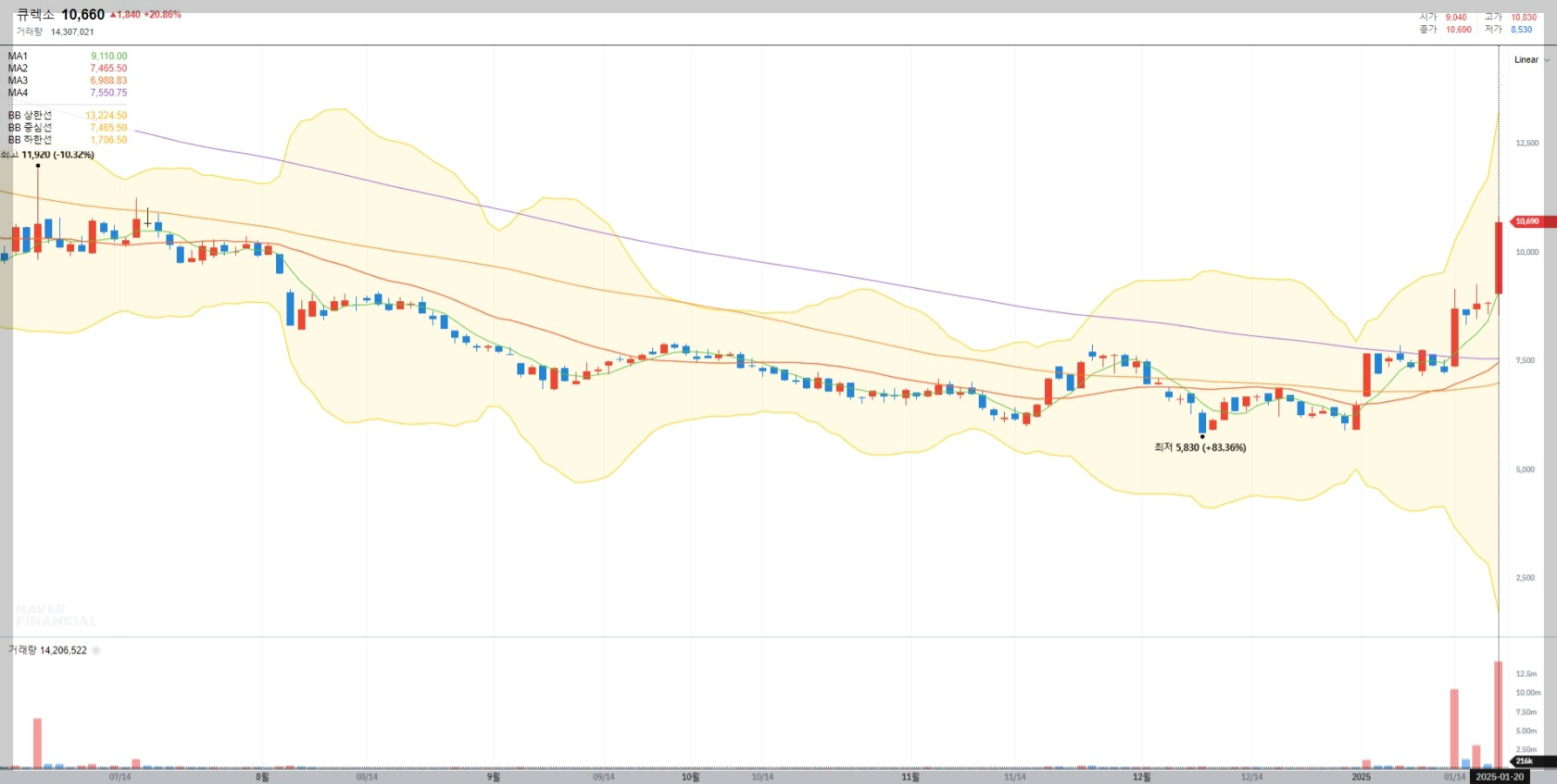 최근 큐렉소의 주가는 볼린저밴드 상단을 돌파하며 강한 상승세를 보이고 있습니다. 이는 단기 과매수 상태를 나타낼 수 있으므로 신중한 접근이 필요합니다.