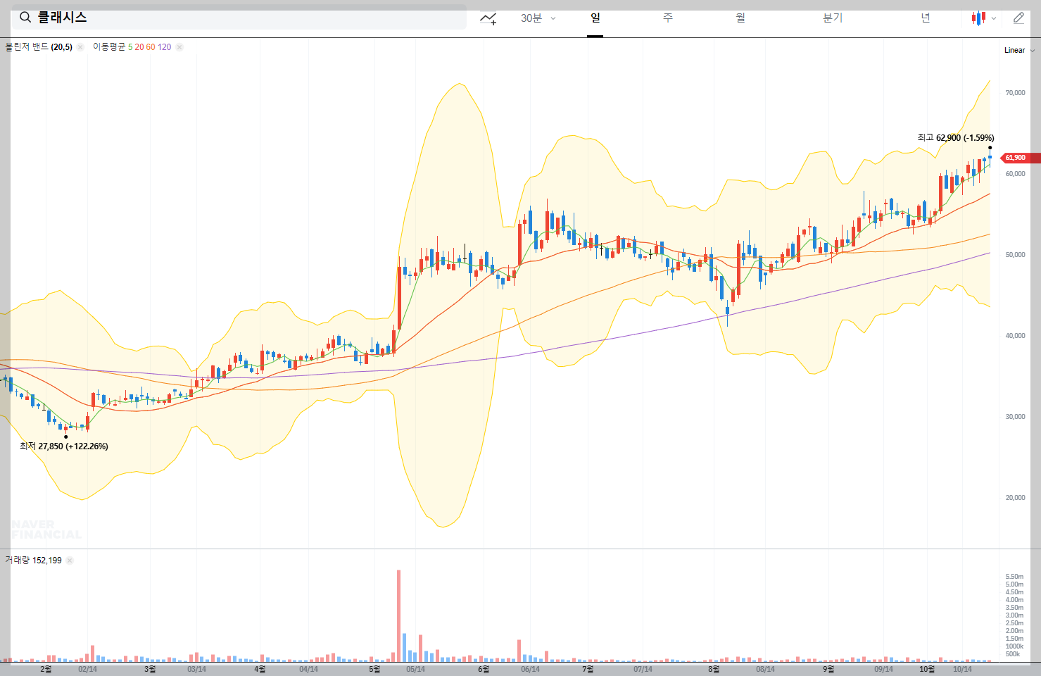 볼린저밴드 매매기법을 통해 클래시스의 주가 변동성을 분석해보면, 최근 주가가 상단 밴드를 돌파하며 강한 상승세를 보이고 있습니다. 이는 추가적인 상승 가능성을 시사합니다.