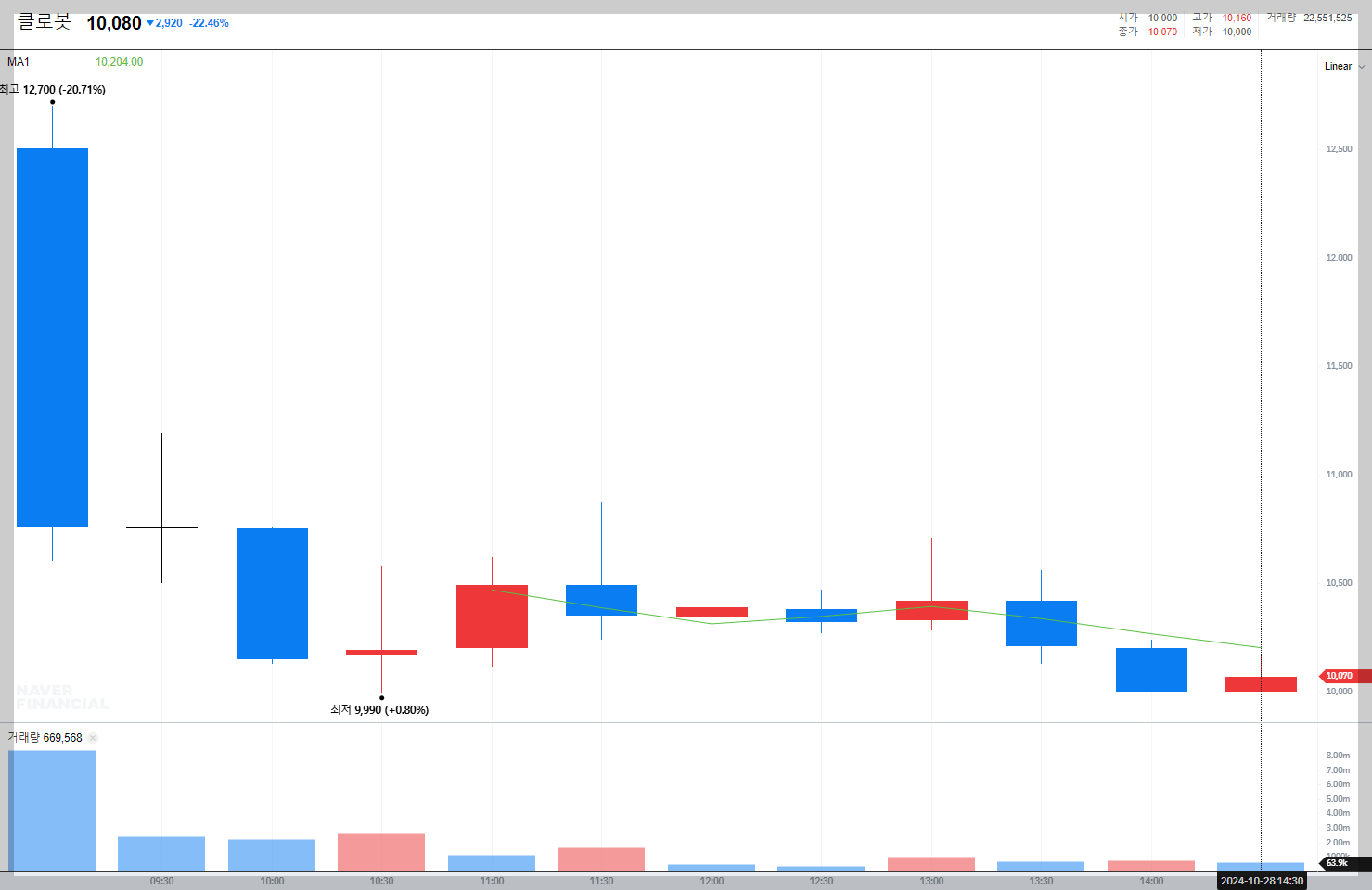 클로봇은 2024년 10월 28일 코스닥 시장에 상장되었습니다. 상장 첫날 주가는 공모가 대비 22% 하락한 1만 100원에 거래되었습니다. 이는 시장의 초기 반응이 다소 부정적이었음을 나타냅니다.