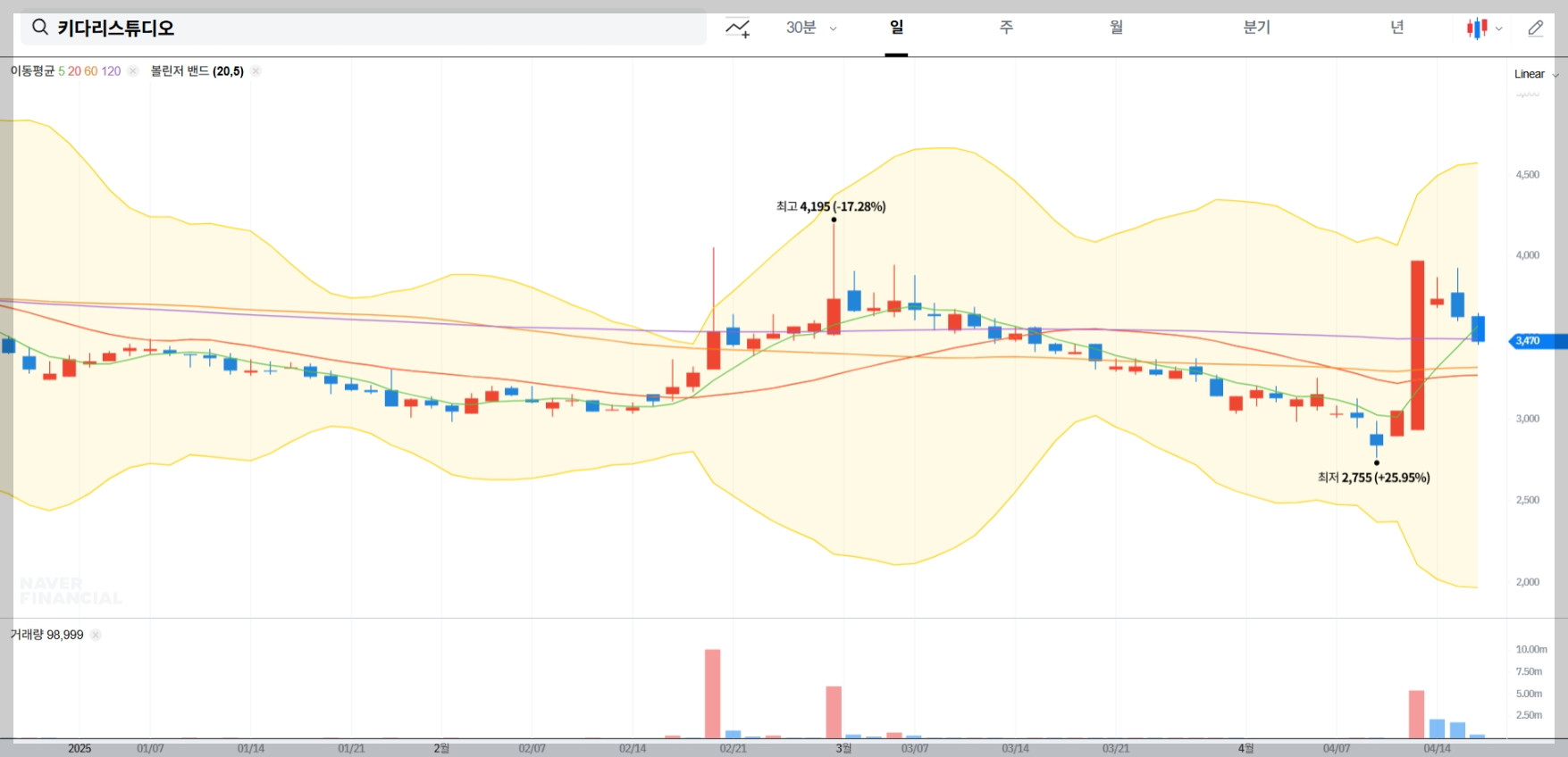 4월 16일 현재 키다리스튜디오의 주가는 3,470원으로, 전일 대비 150원(-4.14%) 하락했습니다. 그러나 시간 외 거래에서는 3,840원(+6.08%)으로 반등하는 모습을 보이고 있어 변동성이 큰 상황입니다.