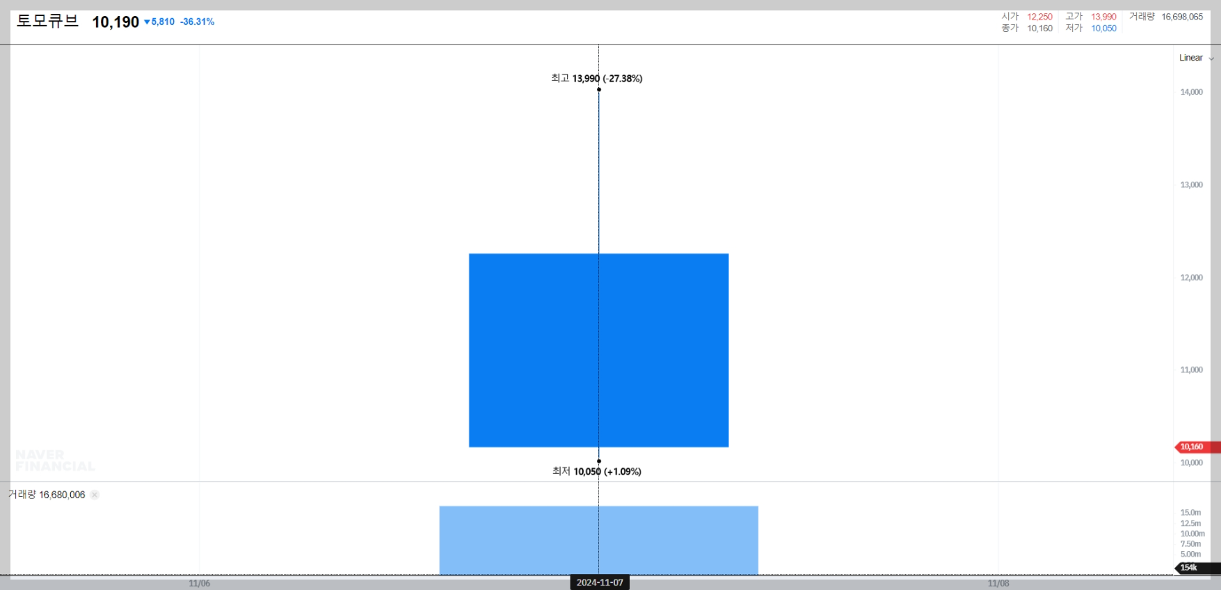 2024년 11월 7일 기준, 토모큐브의 주가는 10,190원을 기록하고 있습니다. 이는 공모가 16,000원 대비 36.31% 하락한 수치입니다. 상장 첫날 하락세를 보이고 있지만, 이는 전반적인 시장 상황과 투자자들의 신중한 태도가 반영된 것으로 보입니다. 52주 최고가와 최저가는 아직 형성되지 않았습니다.