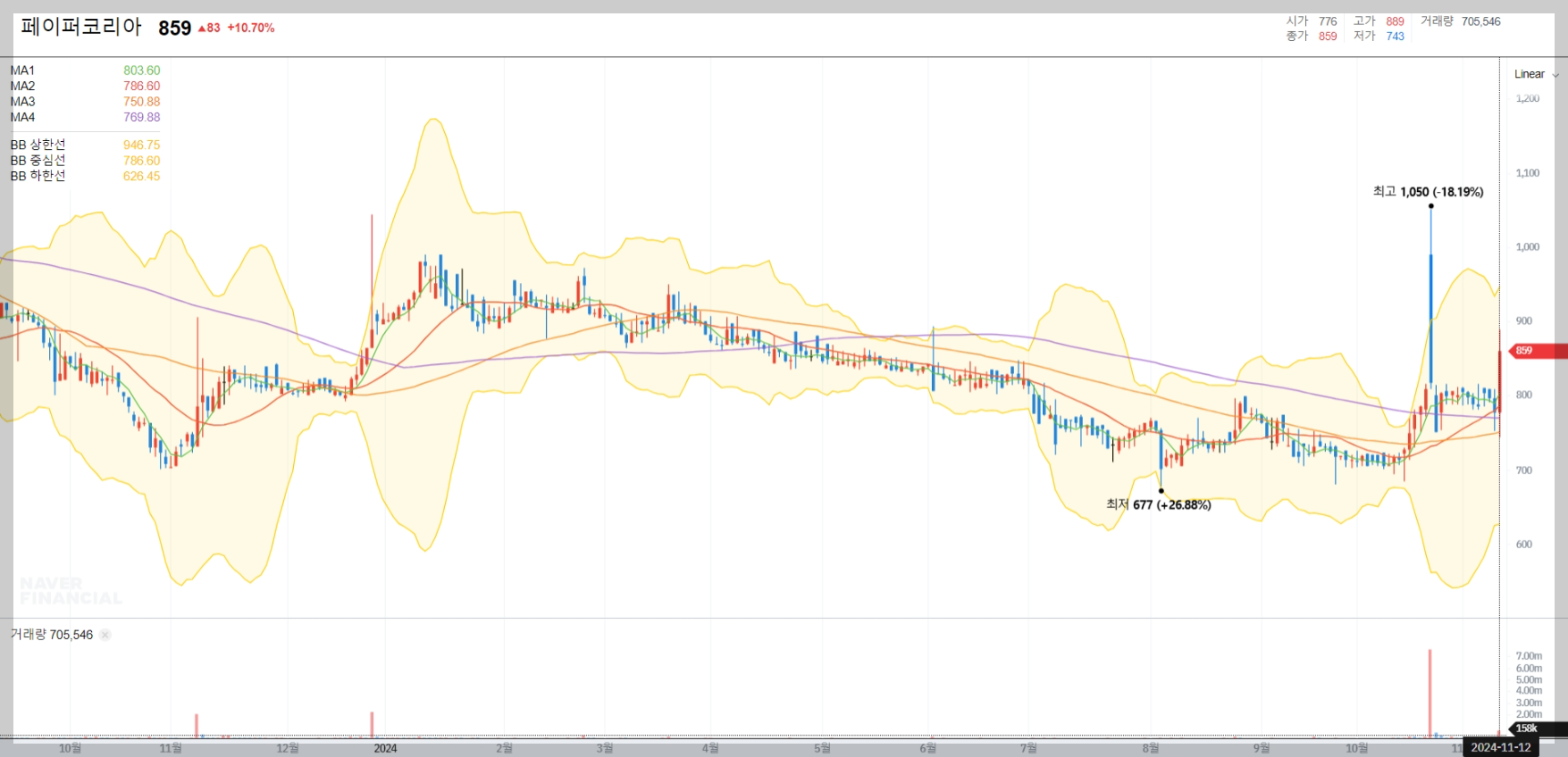 2024년 11월 12일 기준, 페이퍼코리아의 주가는 859원입니다. 전일 대비 83원(10.70%) 상승한 수치입니다. 최근 한 달간의 주가 변동을 살펴보면, 740원에서 820원 사이에서 등락을 반복하고 있어, 비교적 안정적인 흐름을 보이고 있습니다.