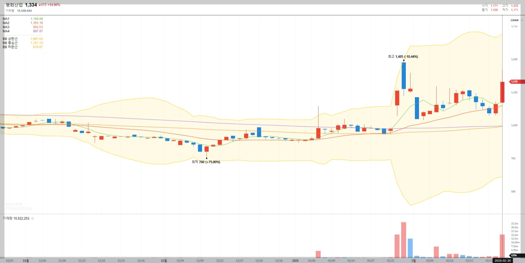 2025년 2월 20일 기준 평화산업의 현재 주가는 1,334원입니다. 최근 몇 달 동안 볼린저밴드 상단에 근접하며 상승세를 보였으나 변동성이 큰 모습을 보이고 있습니다. 투자자들은 이를 고려한 신중한 접근이 필요합니다.