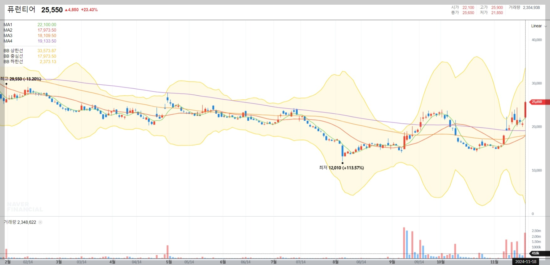 퓨런티어는 최근 주가 상승과 함께 주식 시장에서 큰 주목을 받고 있는 기업입니다. 특히, 2024년 들어 급격한 주가 변동을 보이며 투자자들의 관심을 끌고 있습니다. 이번 글에서는 퓨런티어의 기업 개요부터 주가 분석, 배당금, 그리고 볼린저밴드 매매기법을 활용한 투자 전략까지 깊이 있게 다루어 보겠습니다.