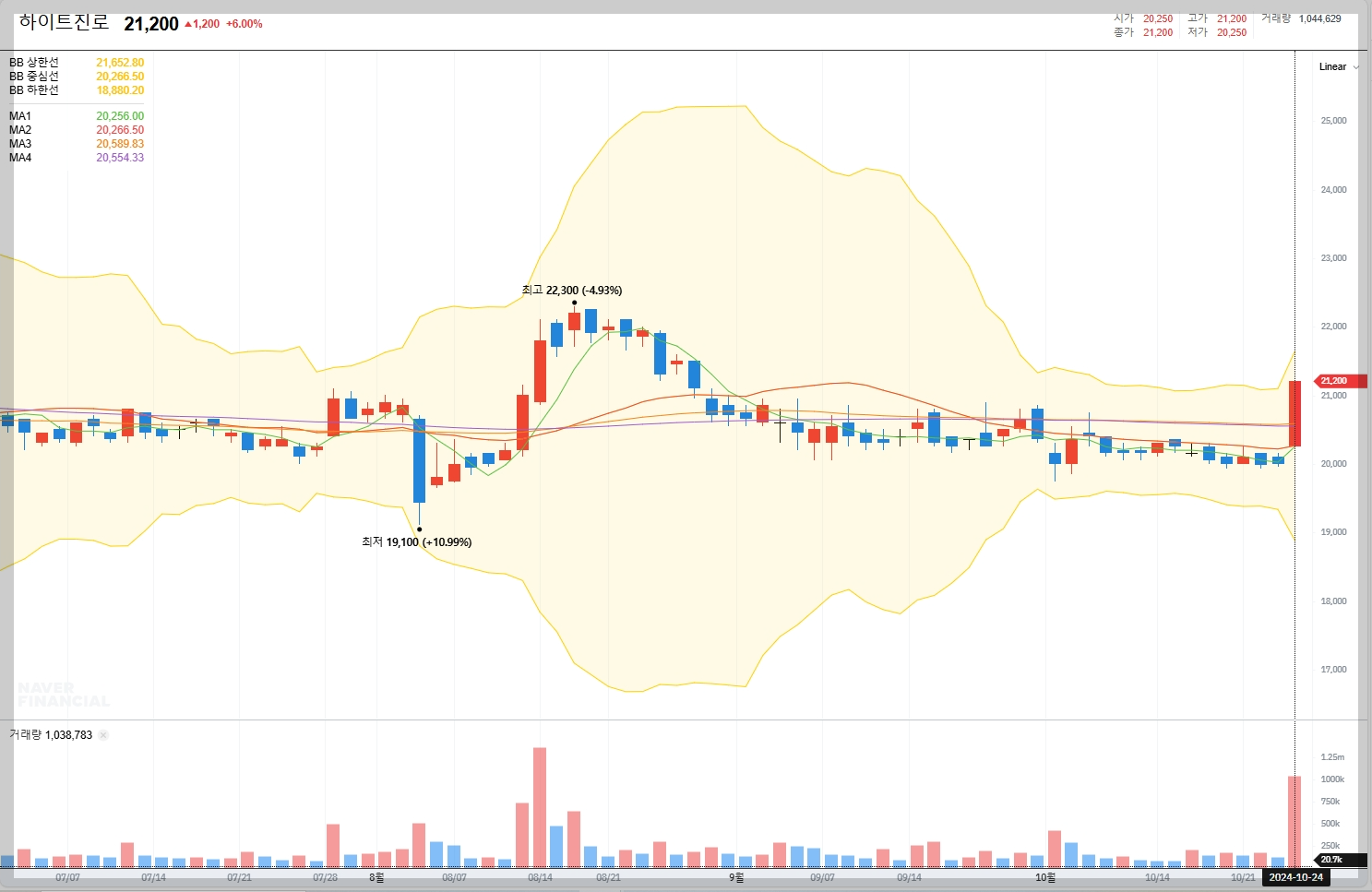 2024년 10월 24일 기준, 하이트진로의 주가는 21,200원입니다. 최근 1년간 주가는 박스권에서 움직이며 안정적인 흐름을 보이고 있습니다.