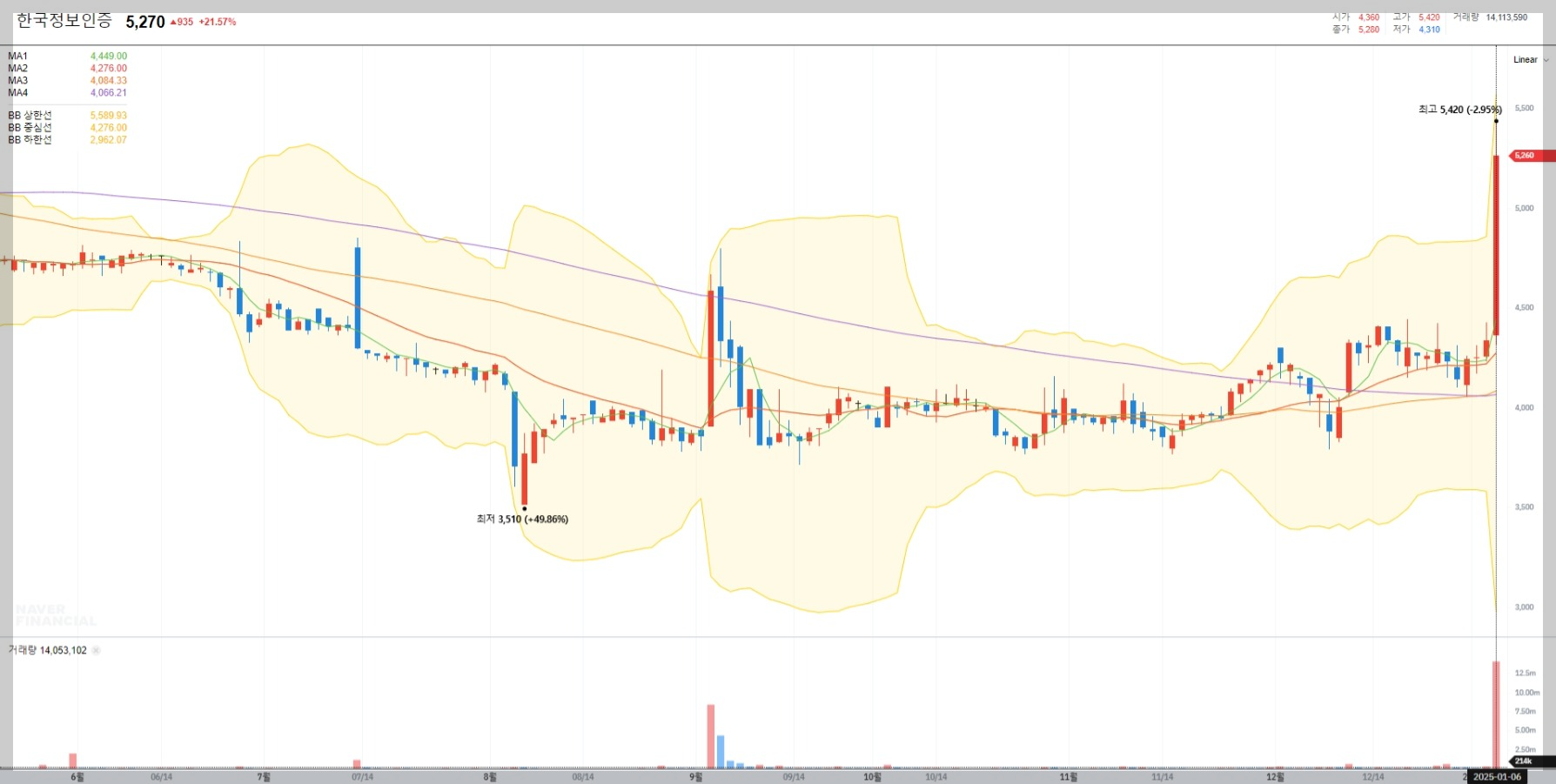현재 한국정보인증의 주가는 5,270원으로 전일 대비 21.57% 상승했습니다. 이는 최근 양자컴퓨팅 관련 기술력과 시장 기대감이 반영된 결과로 해석됩니다.