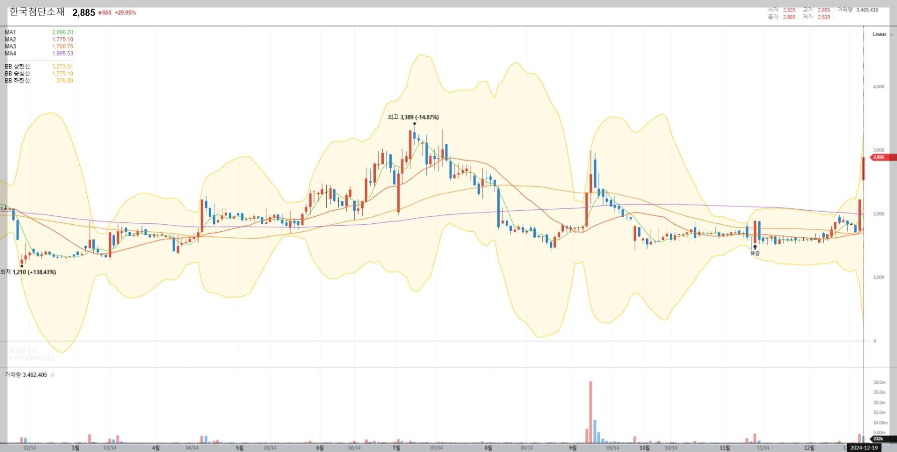 2024년 12월 19일 기준으로 한국첨단소재의 주가는 2,885원으로 전일 대비 29.95% 상승했습니다. 이는 단기적인 거래량 증가와 시장의 긍정적인 반응에 기인합니다.