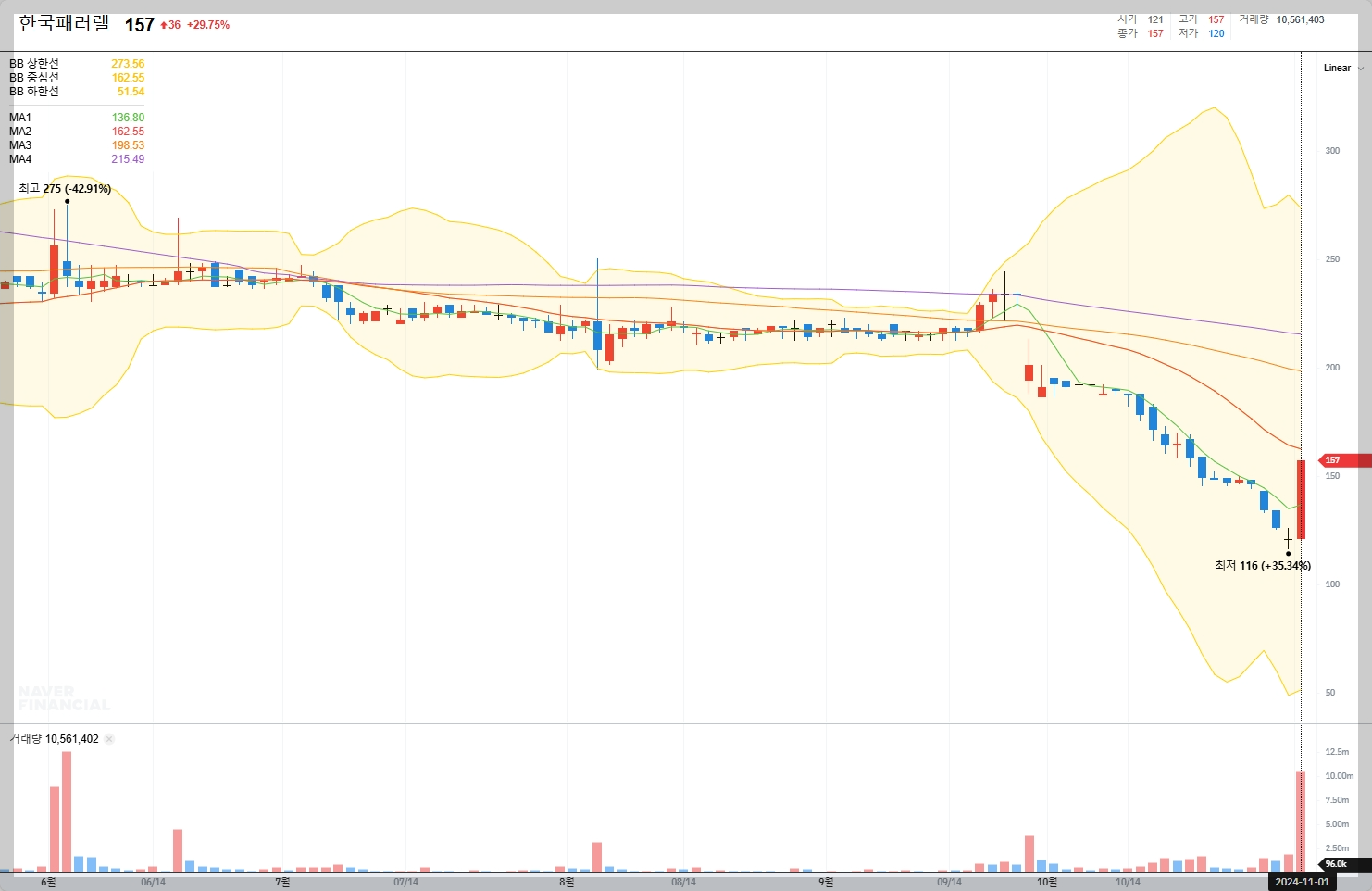 2024년 11월 1일 기준으로 한국패러랠의 주가는 157원으로, 전일 대비 36원 상승했습니다. 최근 52주 최고가는 1,640원, 최저가는 116원입니다.