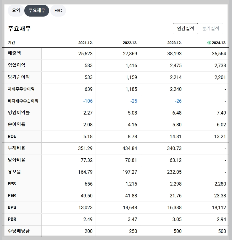 - 2023년 매출액: 38,193억 원 (+37% YoY)