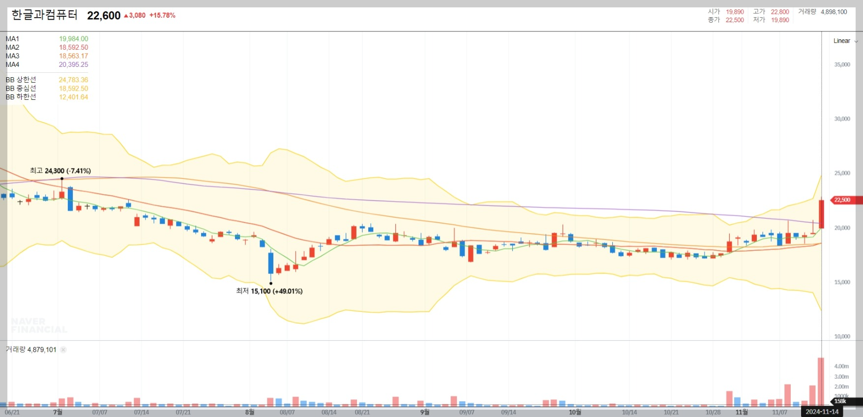 2024년 11월 14일 기준으로 한글과컴퓨터의 주가는 22,600원으로 마감되었습니다. 이는 전일 대비 15.78% 상승한 수치로, 최근 몇 달간의 하락세를 뒤집고 강력한 반등을 보여주고 있습니다. 볼린저밴드 상단을 돌파하면서 강력한 상승 신호를 나타내고 있으며, 거래량도 급증하여 투자자들의 관심이 집중되고 있음을 알 수 있습니다.