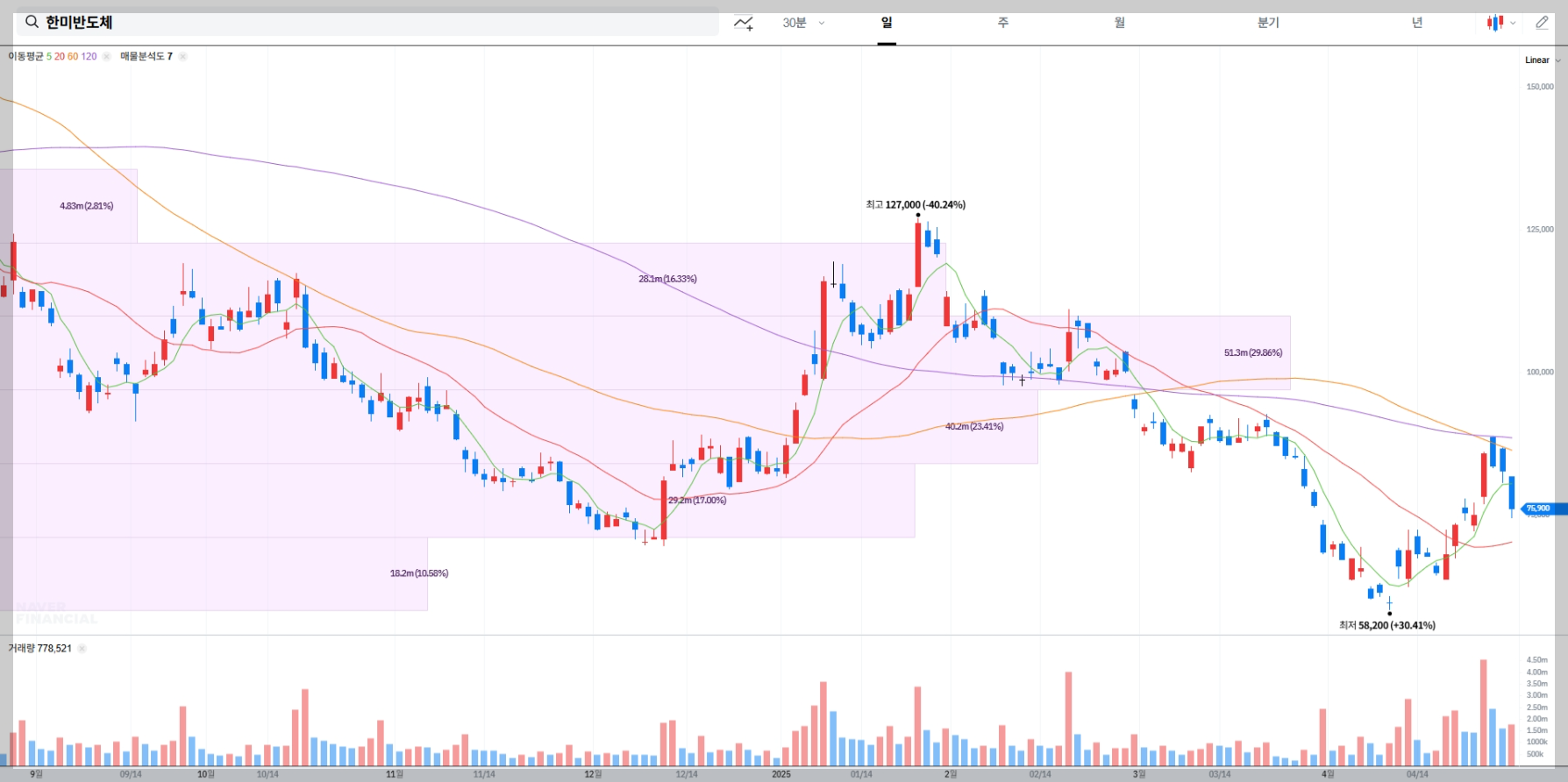 한미반도체의 주가는 현재 80,000원대 초반에 강한 매물대가 형성되어 있습니다. 이 구간은 단기적으로 지지선 역할을 할 수 있으나, SK하이닉스와의 갈등이 심화될 경우 추가 하락 가능성도 있습니다. 연중 최저가인 58,200원까지 하락할 경우 강한 지지선이 될 수 있습니다.