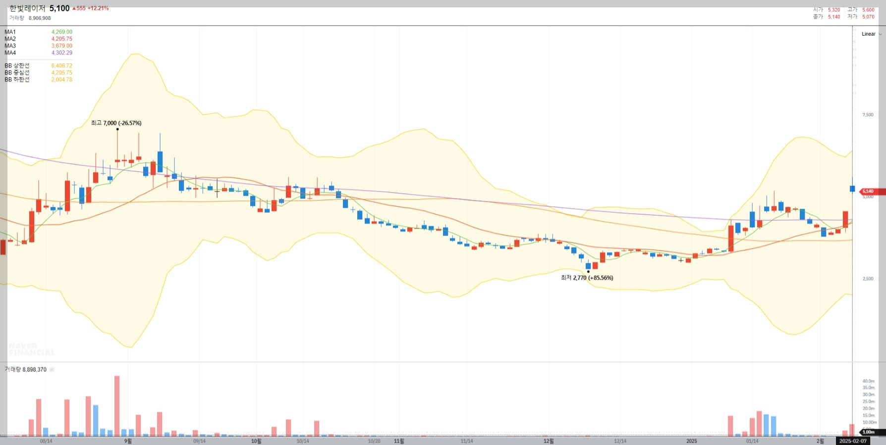 2025년 2월 7일 기준 한빛레이저의 현재 주가는 5,100원으로 전일 대비 12.21% 상승했습니다. 이는 최근 거래량 증가와 함께 단기적인 상승세를 보여주고 있는 모습입니다.