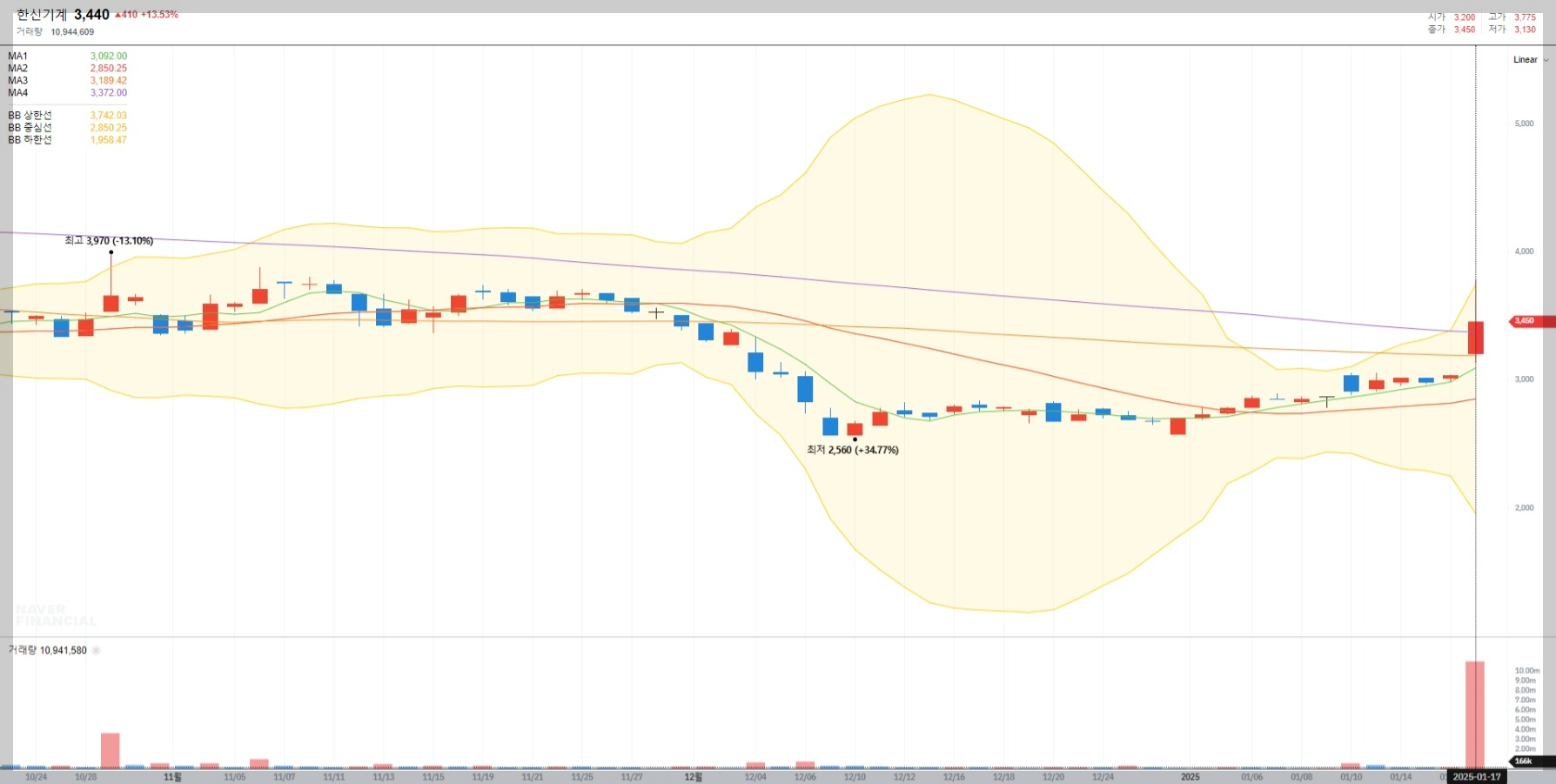2025년 1월 17일 기준 한신기계의 주가는 3,440원으로 전일 대비 13.53% 상승했습니다. 이는 최근 원전 테마와 관련된 긍정적인 소식이 반영된 결과로 보입니다.