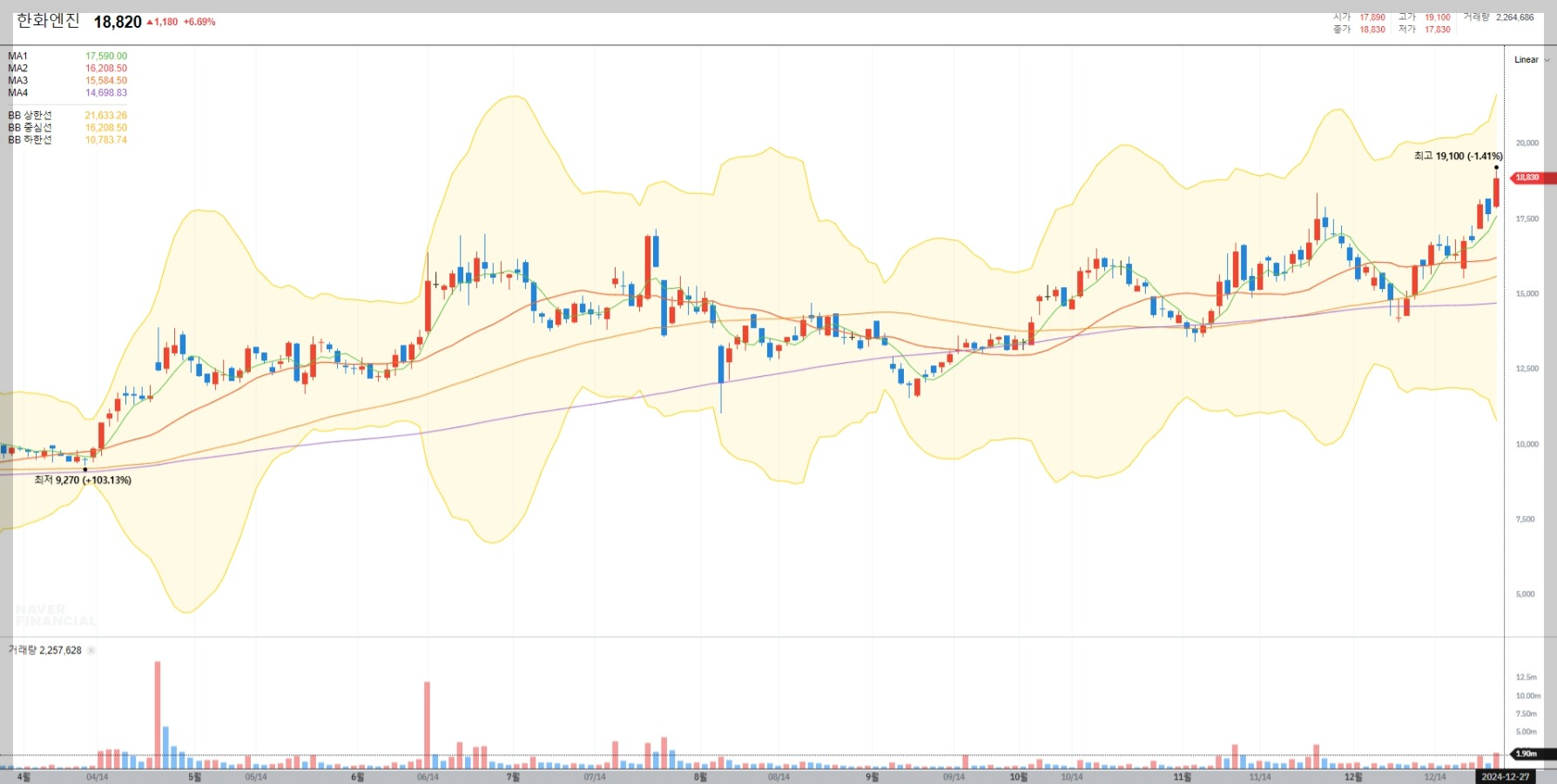 2024년 12월 현재, 한화엔진은 조선기자재 시장에서 강력한 입지를 구축하며 투자자들의 관심을 끌고 있습니다. 이번 글에서는 한화엔진의 기업 개요, 최근 뉴스, 현재 주가 동향, 배당금 정보와 함께 볼린저밴드 매매기법을 활용한 분석을 통해 향후 주가 전망과 목표 주가를 제시하겠습니다.