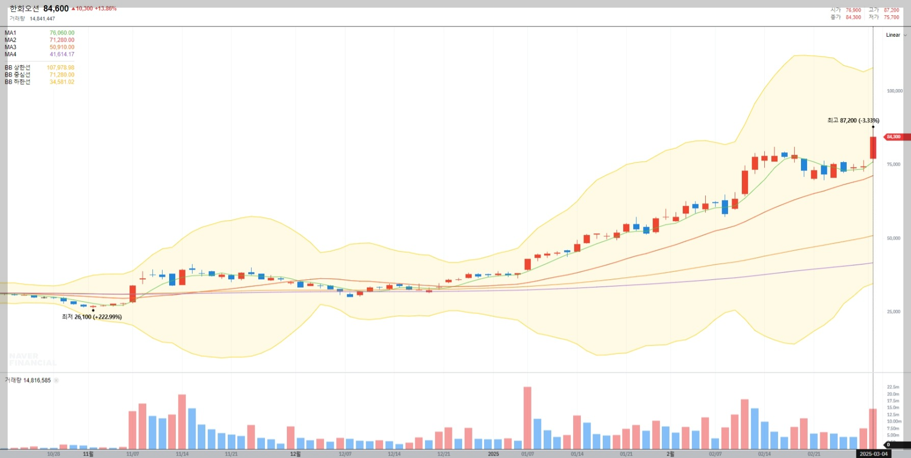 2025년 3월 4일 기준 한화오션의 주가는 84,600원으로 전일 대비 13.86% 상승했습니다. 최근 몇 달간 지속적인 상승세를 보이며 투자자들의 주목을 받고 있습니다.