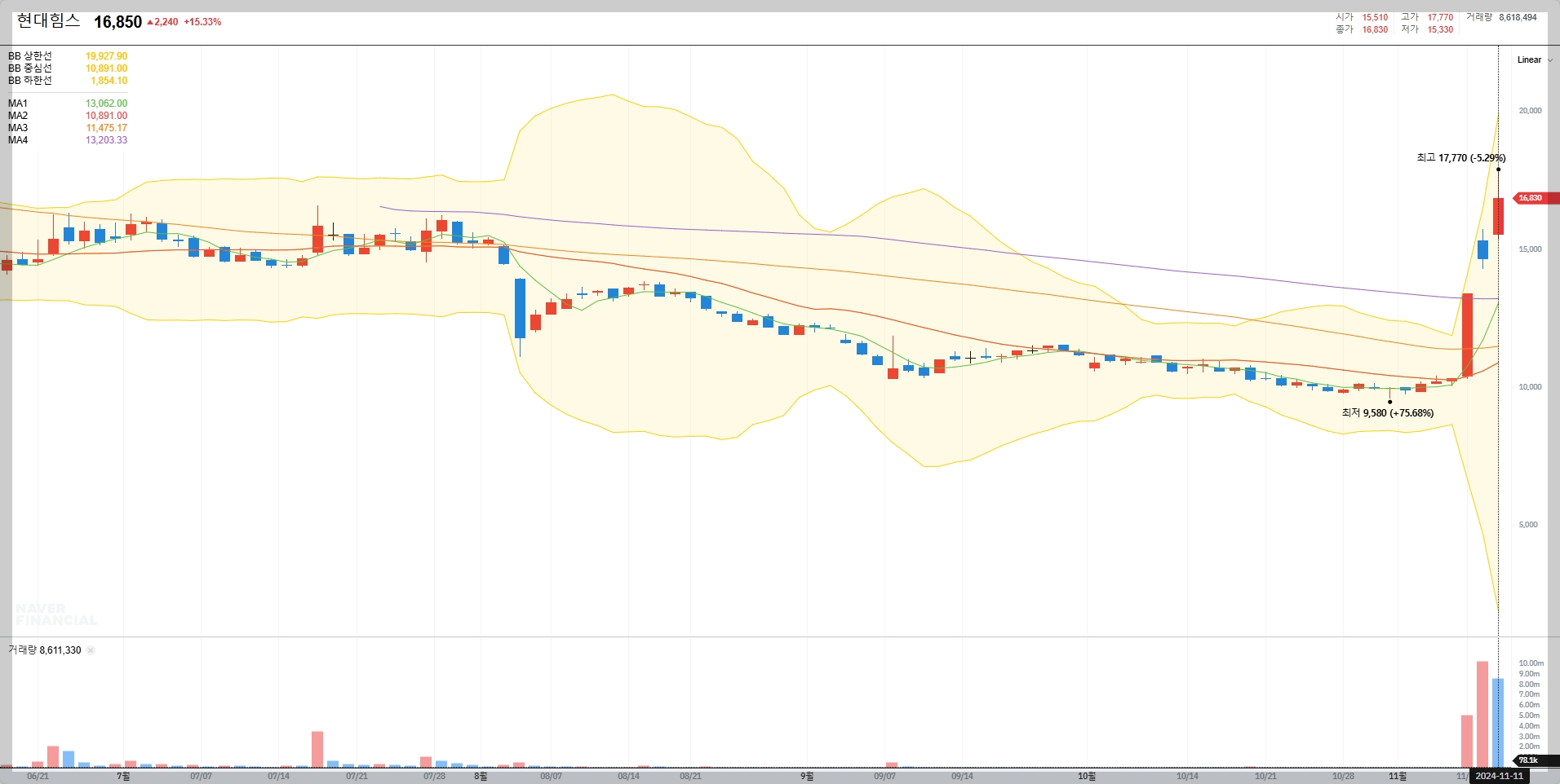 2024년 11월 11일 기준, 현대힘스의 주가는 16,820원으로 전일 대비 15.06% 상승했습니다. 이는 최근 조선업 호황과 신규 수주 소식에 힘입어 투자자들의 관심이 집중된 결과로 보입니다.