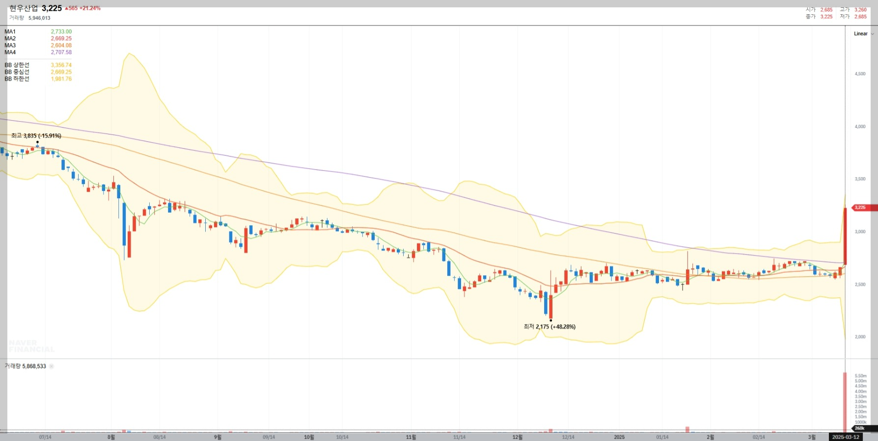 현재 현우산업의 주가는 3,225원으로 전일 대비 21.24% 상승했습니다. 거래량은 약 5,946,013주로 활발한 거래가 이루어지고 있으며, 이는 투자자들의 관심이 집중되고 있다는 것을 보여줍니다.