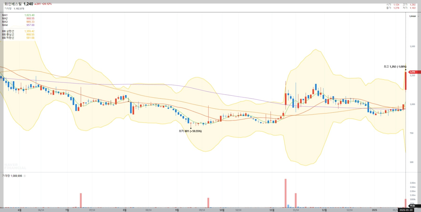 2025년 1월 20일 기준 화인베스틸의 주가는 1,240원으로 전일 대비 24.12% 상승했습니다. 이는 스마트공장 구축과 같은 긍정적인 이슈가 반영된 결과로 보입니다.