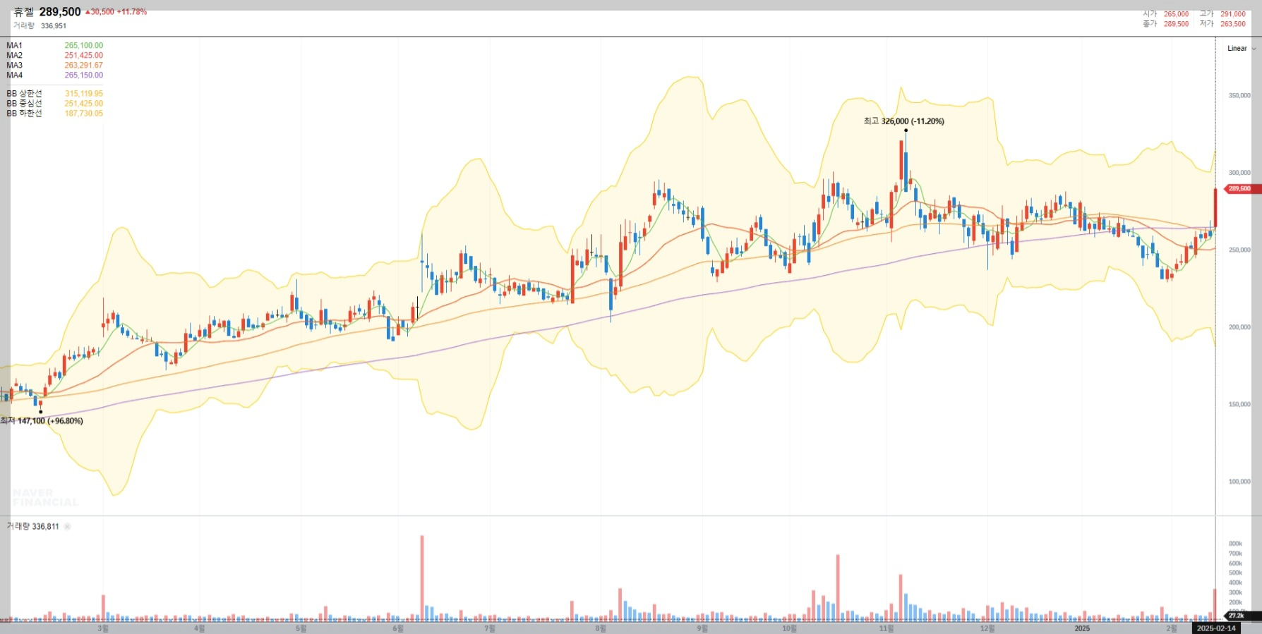 2025년 2월 14일 기준, 휴젤의 현재 주가는 289,500원으로 전일 대비 11.78% 상승했습니다. 이는 최근 시장에서 긍정적인 평가를 받은 결과로 볼 수 있습니다.