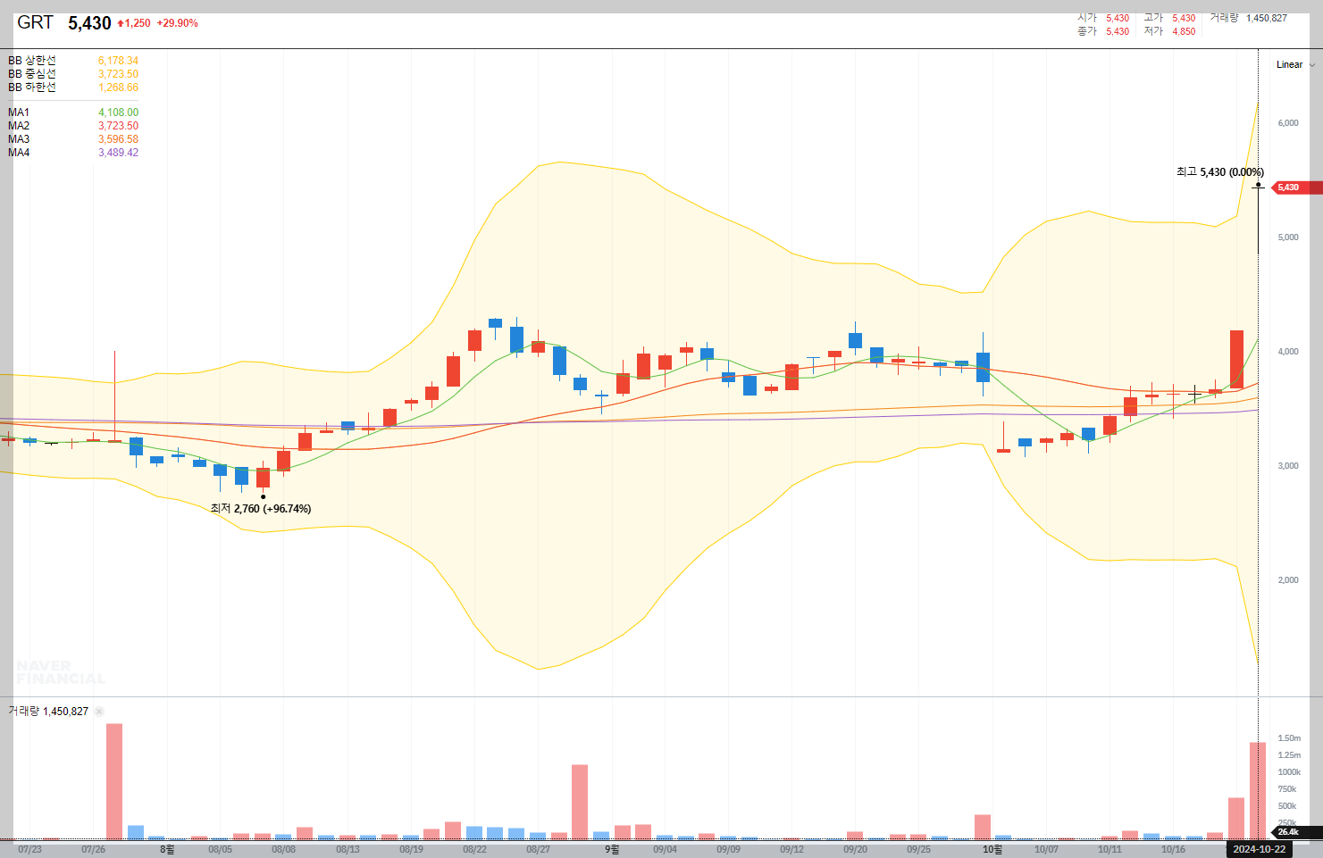 볼린저밴드 매매기법을 통해 GRT의 주가 변동성을 분석해보면, 최근 주가가 상단 밴드를 돌파하며 강한 상승세를 보이고 있습니다. 이는 추가적인 상승 가능성을 시사합니다.