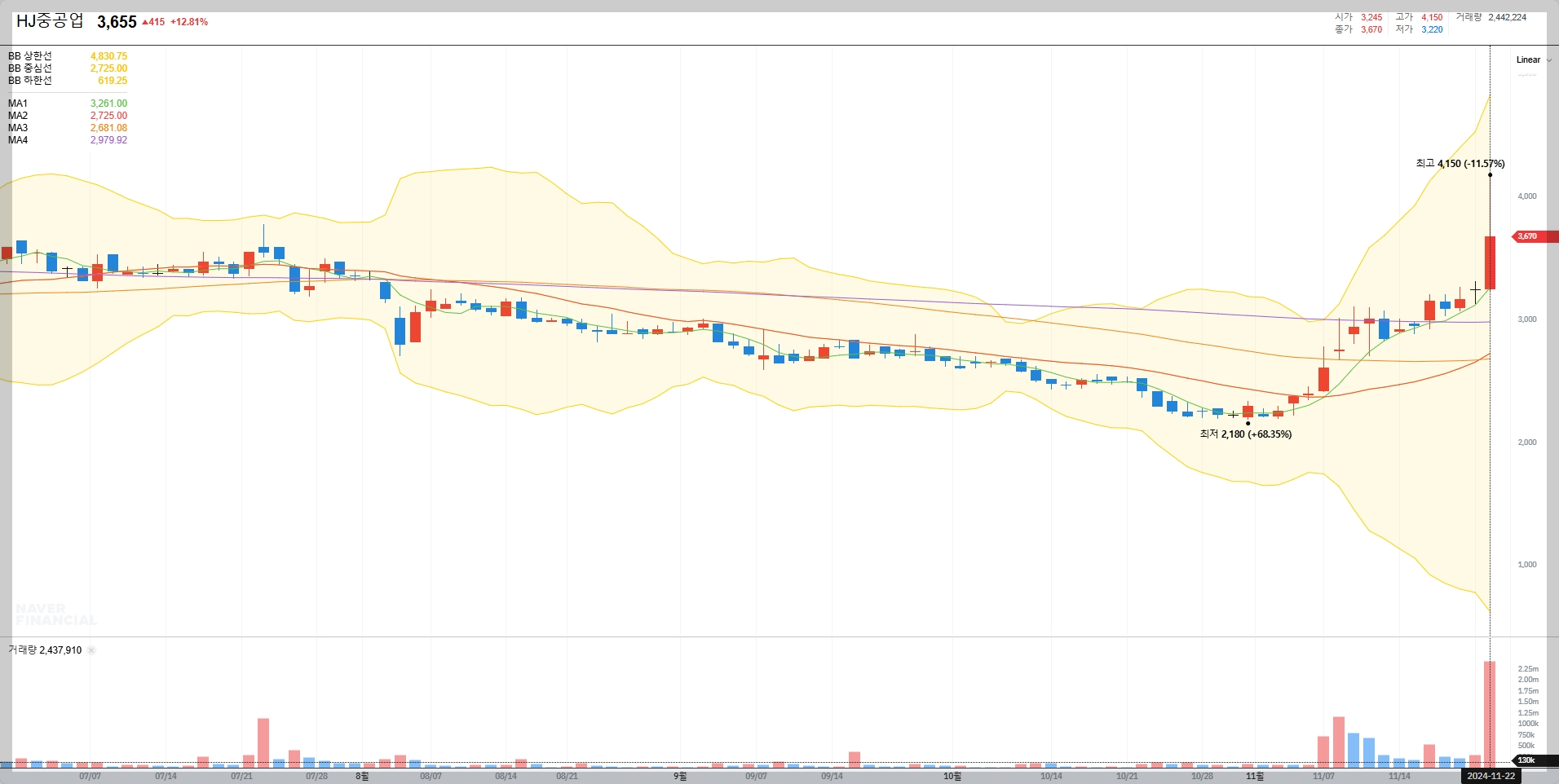 2024년 11월 22일 기준 HJ중공업의 주가는 3,655원으로 전일 대비 12.81% 상승했습니다. 최근 볼린저밴드 상단을 돌파하며 강한 상승세를 보이고 있어 추가 상승 가능성이 점쳐지고 있습니다.