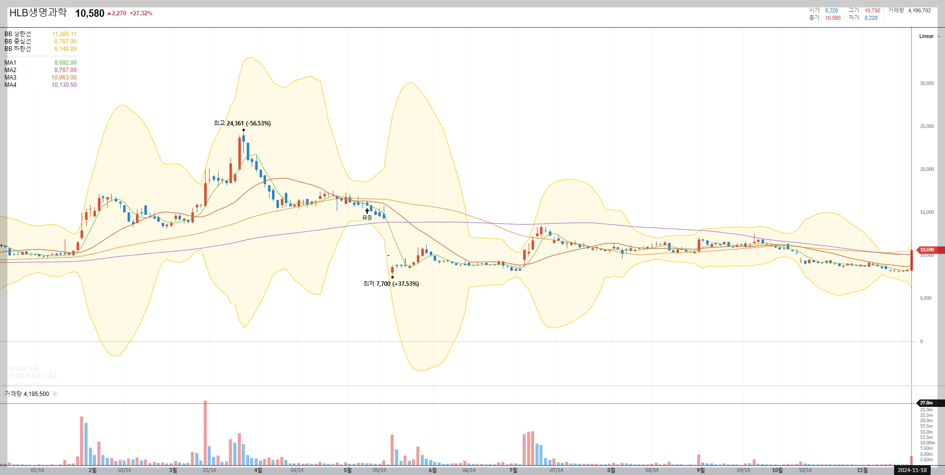 2024년 11월 기준, HLB생명과학의 주가는 약 10,580원으로 기록되었습니다. 최근 주가는 변동성이 크며, 최고가는 약 24,361원(56.53% 상승), 최저가는 약 7,700원(37.53% 상승)을 기록한 바 있습니다. 현재 주가는 하락세를 보이고 있지만, 신약 허가 소식에 따라 제반등할 가능성도 존재합니다.
