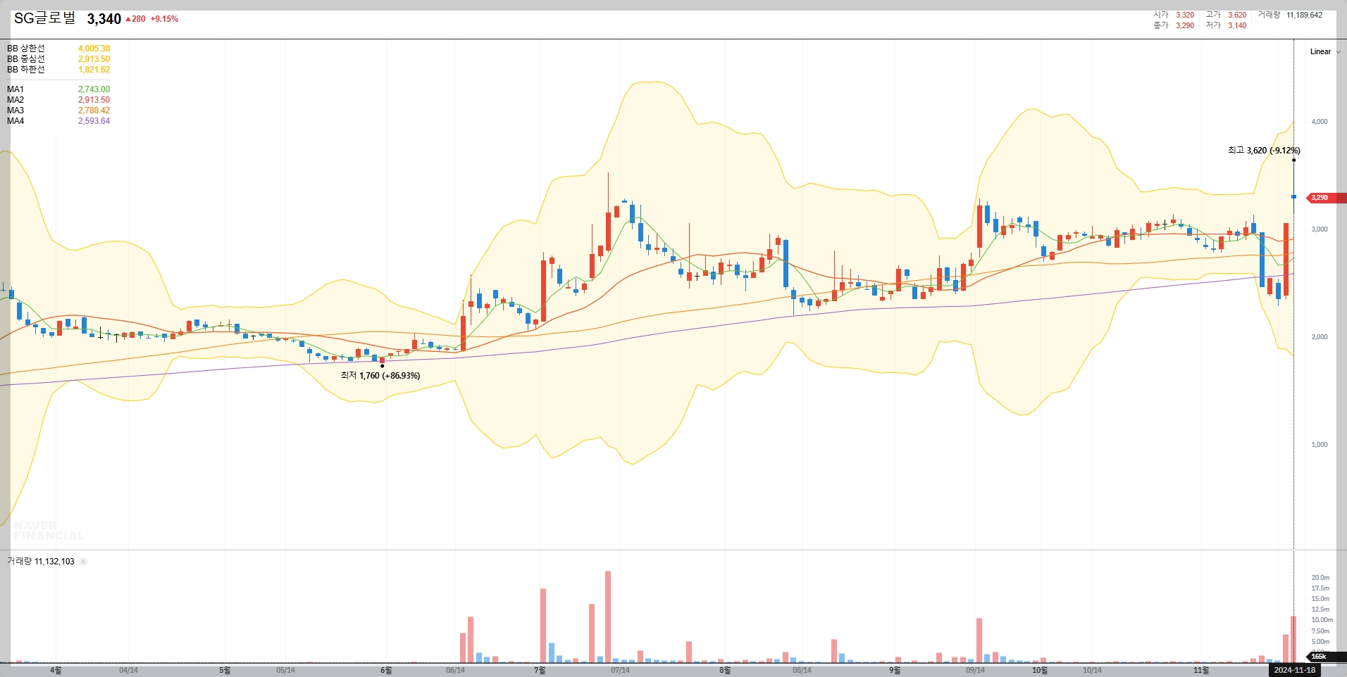 SG글로벌은 2024년 들어 다양한 호재와 악재로 인해 큰 변동성을 보였습니다. 최근 11월 18일 기준으로 주가는 3,340원으로 마감되었으며, 이는 전일 대비 9.15% 하락한 수치입니다. 외국인과 기관의 매도세가 이어지면서 단기적으로는 하락세를 보이고 있지만, 장기적으로는 회복 가능성이 높다는 평가를 받고 있습니다.