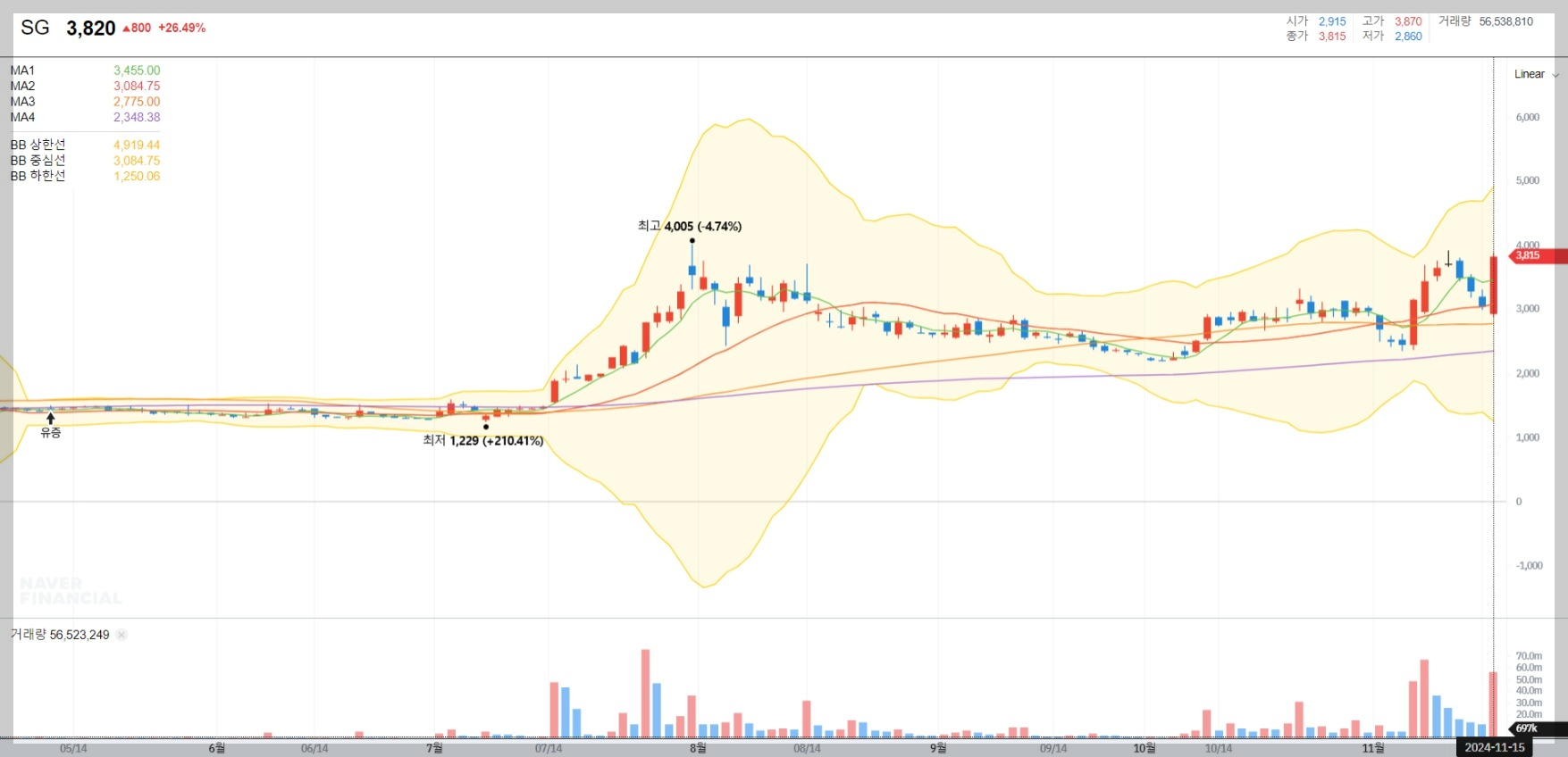 SG는 최근 몇 달 동안 급격한 주가 상승과 하락을 겪으며 시장의 관심을 받았습니다. 특히 2024년 11월 15일 기준으로 주가는 전일 대비 26.49% 상승한 3,820원을 기록하며 강세를 보였습니다. 이러한 급등은 특정 뉴스나 이벤트에 따른 것이 아니라 시장 내 수급 상황에 기인한 것으로 보입니다.