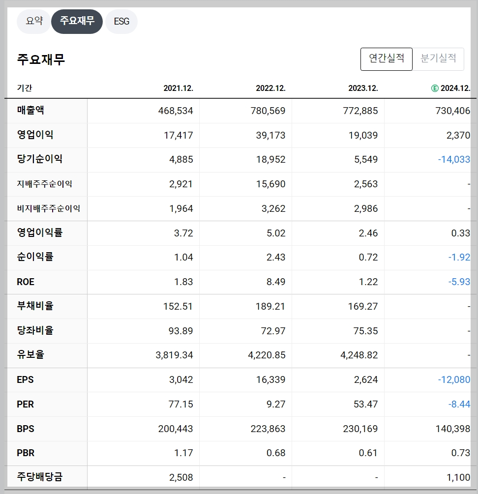 2024년 예상 실적을 보면 매출액은 약 730,406억 원으로 감소할 것으로 예상되며 영업이익 역시 크게 줄어들 것으로 보입니다. 특히 당기순손익은 -14,033억 원으로 적자를 기록할 것으로 예상되어 재무 건전성에 대한 우려를 낳고 있습니다.
